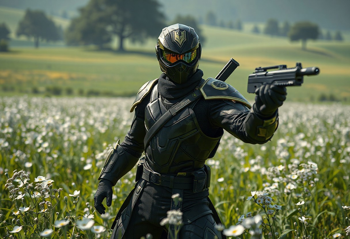 Aqua Armor Ninja in black suit with gold accents, holding gun, dynamic action pose, helmet visor, standing in vibrant verdant field, white flowers, distant trees. Dramatic cinematic lighting, wide angle. Octane render, Unreal Engine 5, trending on ArtstationHQ, CGSociety, photorealistic, hyperdetailed, 8k, shot by James Jean.
