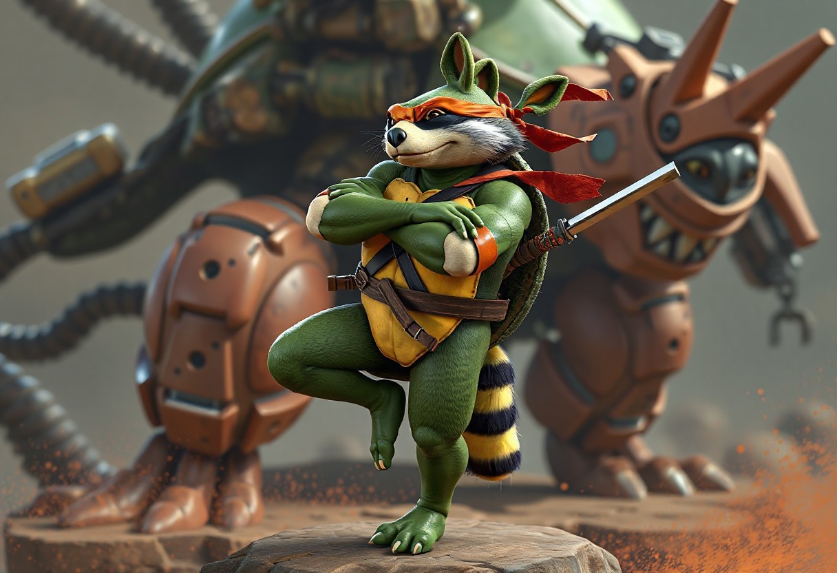A dynamic action pose of Turtle Raccoon, standing on one leg, arms crossed, holding two nunchucks, dressed in green and orange outfit with red bandana, against a detailed Mecha Phantom Beast Turtletracer background. Isometric view, high-res 4k, octane render, unreal engine 5, splash ink illustration, Raphael style, houdini style, cinematic lighting, sharp lines, vibrant colors. Trending on Artstation, CGSociety, masterpiece, impeccable composition, creative angle.