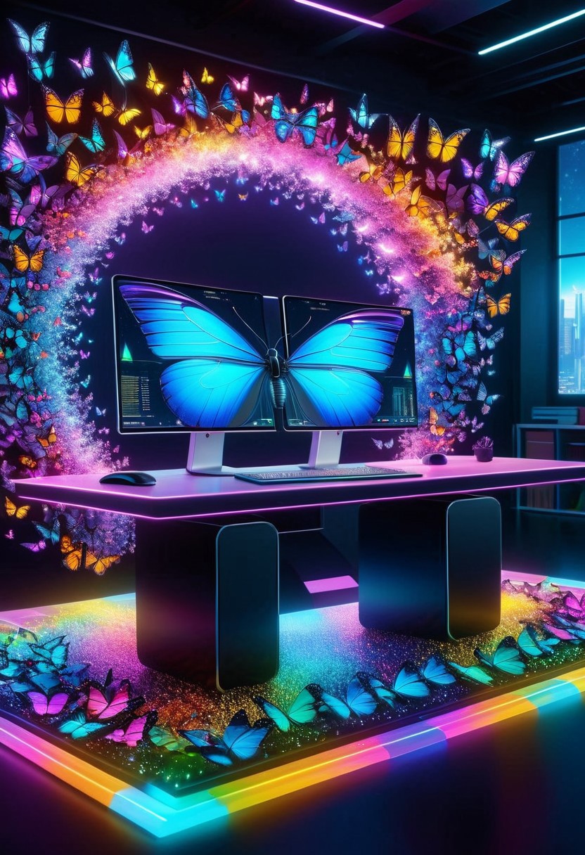 butterflyStyle, futuristic workspace, digital art, dual monitors, VR headset, AI robot, glowing holograms, surreal tech, floating graphs, colorful rainbows, digital interface, neon lighting, sci-fi office, technology innovation, creative tech environment, vibrant colors, cyberpunk aesthetics, tech evolution, future labl