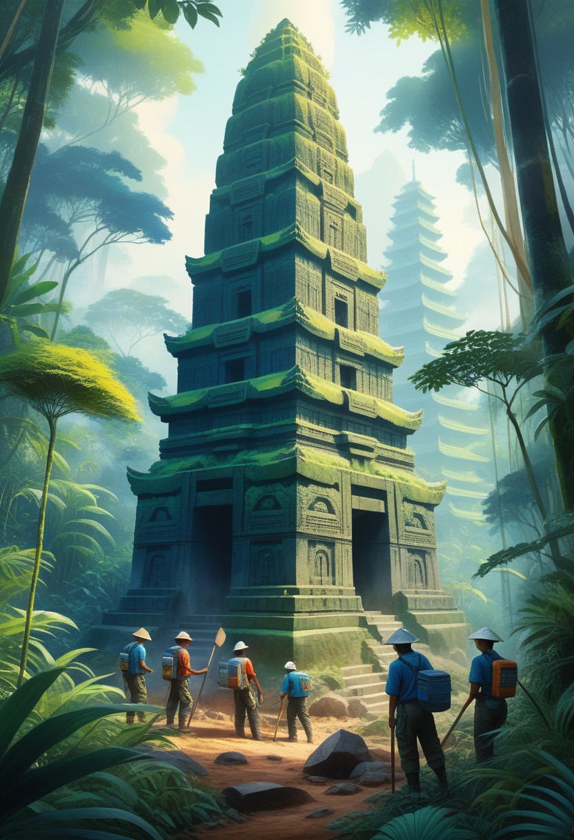 Watercolor painting. Medium shot. An excavation team unearths a pulsating monolith buried in a lush, tropical jungle, its spires piercing the canopy. The scene is bathed in a soft, dreamlike light, with colors blending seamlessly into one another. The style evokes traditional Japanese art, with delicate brushwork and intricate patterns. The team is rendered with finely observed details, creating a harmonious composition. The lighting is soft and diffused. A masterpiece, best quality, 8k resolution, trending on Artstation.