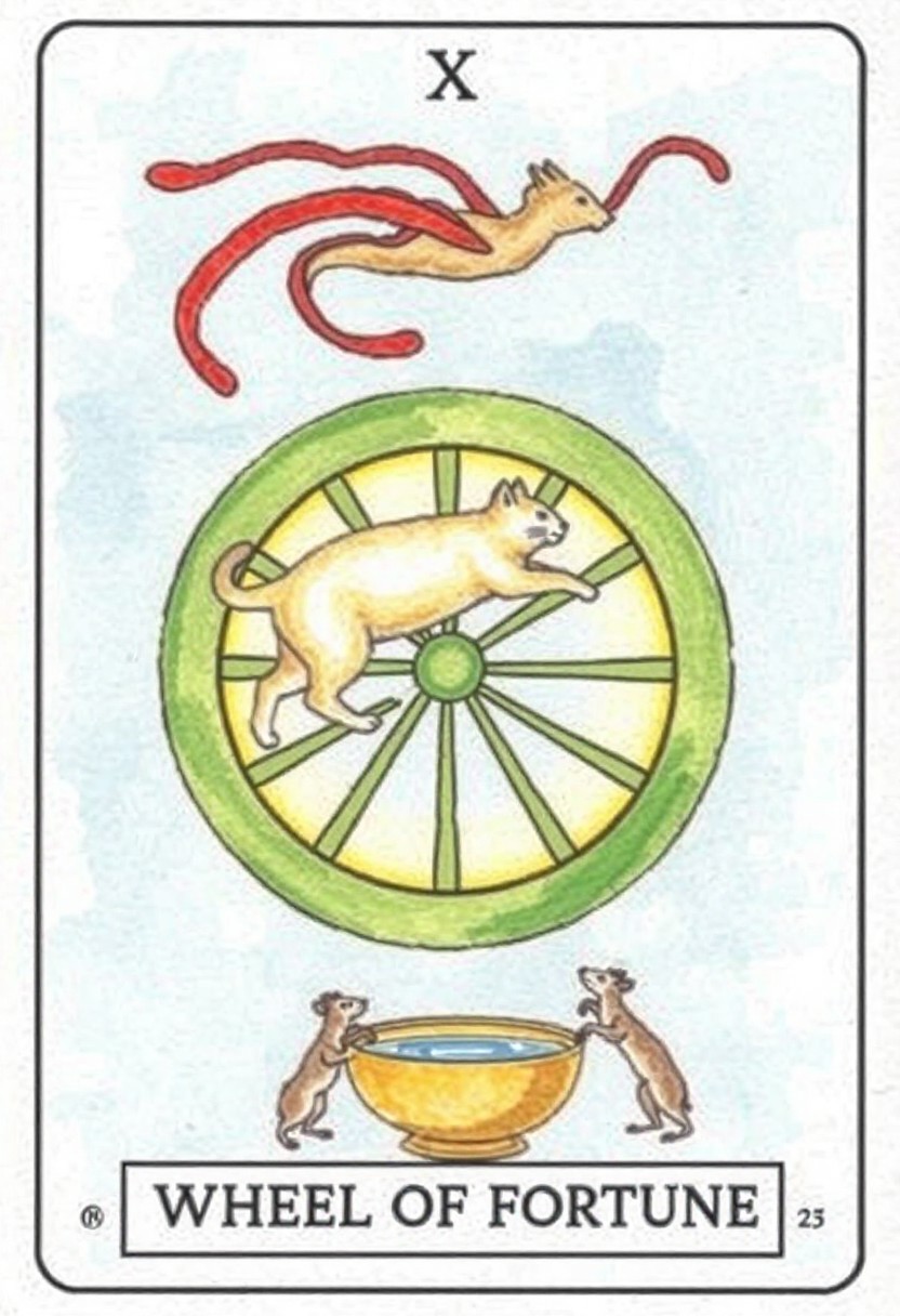 This image displays a tarot card, specifically the "Wheel of Fortune," as indicated by the text at the bottom. The card's central motif is a large, green wheel with a golden interior, resembling a classic wheel of fortune. A light-colored feline creature, possibly a cat, is depicted walking or running along the inner edge of the wheel, positioned horizontally. Above the wheel, a stylized winged creature, possibly a bird or dragon with a long, flowing red ribbon, hovers in a dynamic pose. Below the wheel, two smaller, rodent-like creatures stand on either side of a bowl filled with a blue liquid, perhaps water. The background is a soft blue, suggesting a sky, and the overall aesthetic appears to be a watercolor or hand-drawn style, with visible brushstrokes and a somewhat whimsical, illustrative quality. A subtle number 'X' is present at the very top of the card, signifying its traditional numerical placement within the Major Arcana.
