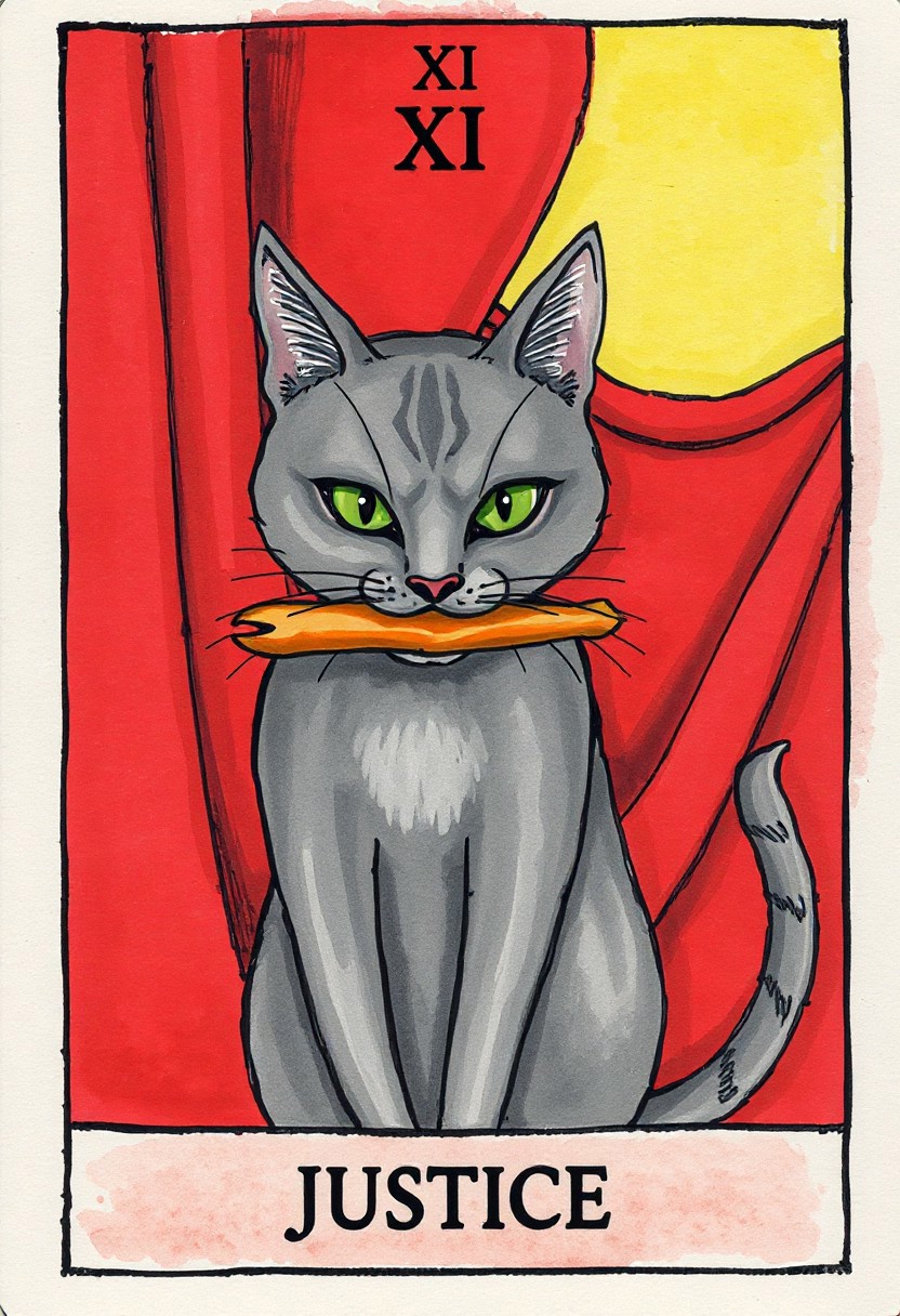 This image depicts a tarot card, specifically the "Justice" card, as indicated by the text at the bottom. The central figure is a gray feline with striking green eyes, holding an orange, somewhat limb-like object firmly in its mouth. The cat's expression appears intense and focused. Behind the feline, a dramatic swathe of deep red drapery forms the background, creating a sense of depth and perhaps solemnity. Above the cat and the drapery, a strip of light yellow is visible, suggesting a sky or a source of light. At the very top of the card, the Roman numeral 'XI' is prominently displayed, signifying its traditional number within the Major Arcana. The artwork has a distinct hand-painted or watercolor feel, with visible brushstrokes and a somewhat stylized, illustrative quality. The overall composition is simple yet impactful, drawing the viewer's eye to the central figure and its action, set against the rich red backdrop.