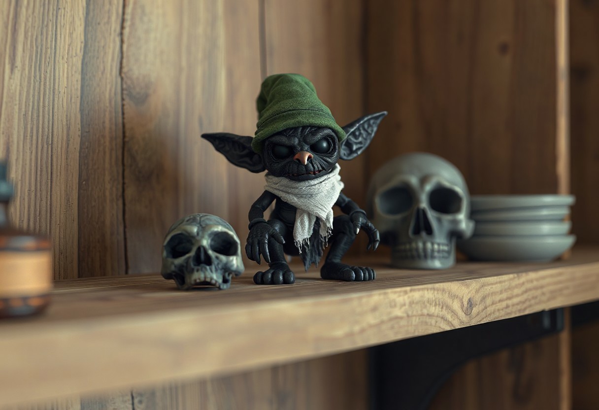A black grimdark Scrap Goblin, adorned with a green hat and white scarf, sits on a wooden shelf. A gray skull is arranged beside it. A focused still life, intricate details pop against a blurred background. Grimdark aesthetic. Highly detailed render, volumetric lighting, ray tracing, 8k. Trending on Artstation, CGSociety.