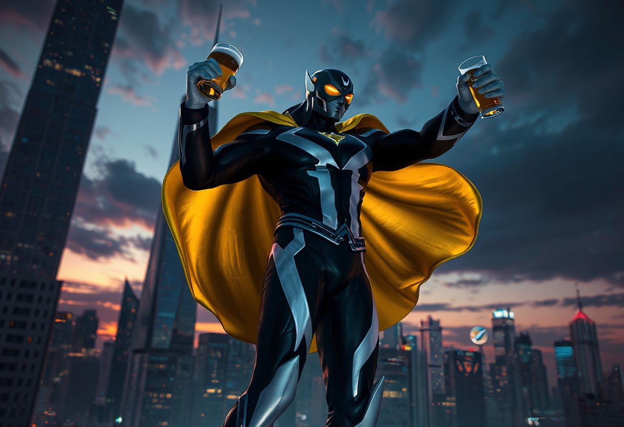An epic Elemental HERO Electrum, clad in iconic black and white suit with flowing yellow cape, slightly left of frame, takes a moment of respite. He holds a beer glass while his other fist remains resolutely raised. Standing against a towering skyscraper skyline at twilight, city lights glowing below. Cinematic matte painting, digital art, Octane Render, Unreal Engine 5, dramatic rim lighting, low angle, golden ratio composition, high detail, 4K, trending on Artstation, CGSociety.