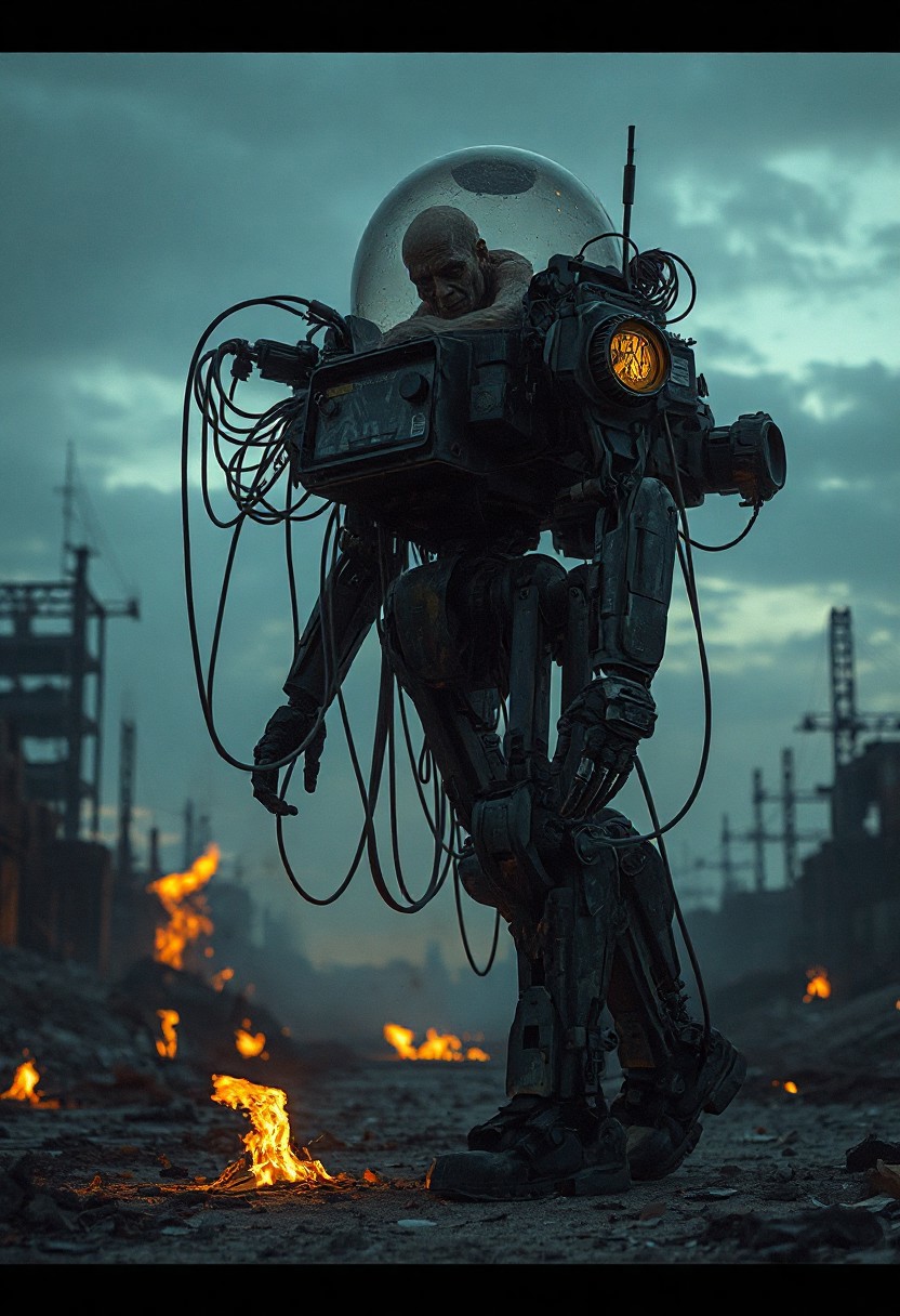 It is dawn. Various fires light up the area. an action filled movie shot of a tall walking mecha robot with a lot of dangling cables and visible machinery in a broken urban setting. The robot has a backpack with a glass dome. Inside the dome is the withered remains of an old human. The human is used to power the robot and is connected with cables. realistic, the robot is engaged in warfare, combat, sitting in a combat position with one knee up and one hand on the ground. 4k, futuristic, fallout-inspired, Retrofuturism, atomic-punk