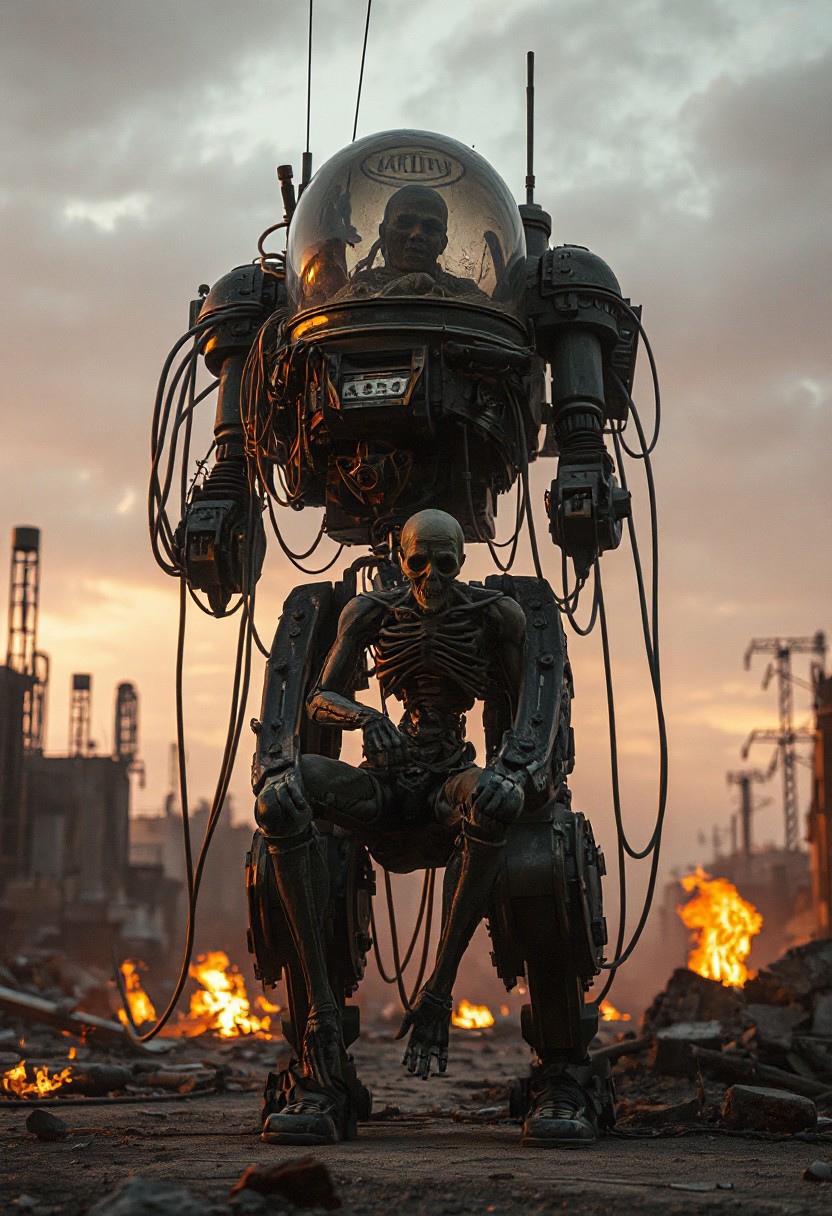 It is dawn. Various fires light up the area. an action filled movie shot of a tall walking mecha robot with a lot of dangling cables and visible machinery in a broken urban setting. The robot has a backpack with a glass dome. Inside the dome is the withered remains of an old human. The human is used to power the robot and is connected with cables. realistic, the robot is engaged in warfare, combat, sitting in a combat position with one knee up and one hand on the ground. 4k, futuristic, fallout-inspired, Retrofuturism, atomic-punk