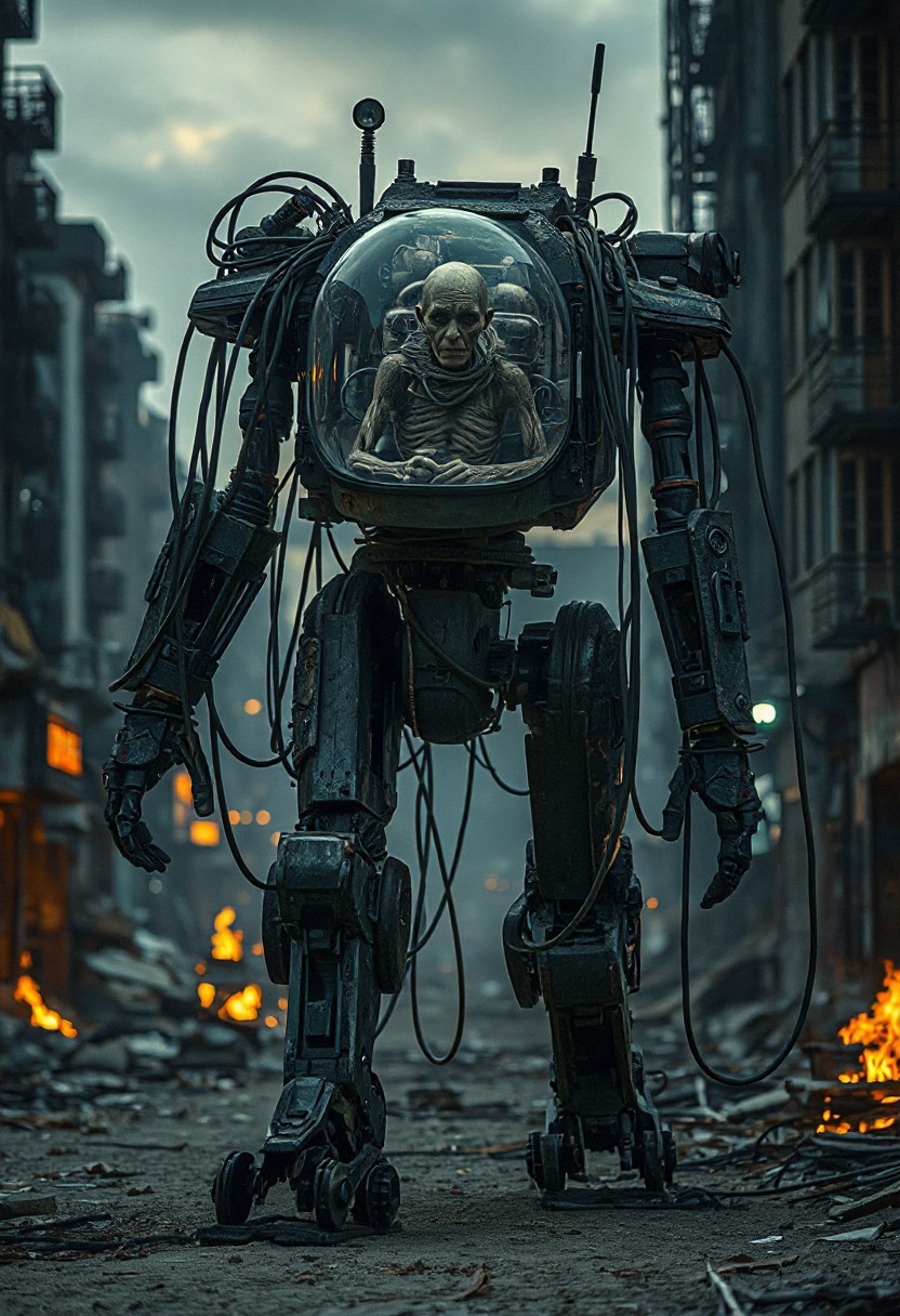 It is dawn. Various fires light up the area. an action filled movie shot of a tall walking mecha robot with a lot of dangling cables and visible machinery in a broken urban setting. The robot has a backpack with a glass dome. Inside the dome is the withered remains of an old human. The human is used to power the robot and is connected with cables. realistic, the robot is engaged in warfare, combat, sitting in a combat position with one knee up and one hand on the ground. 4k, futuristic, fallout-inspired, Retrofuturism, atomic-punk