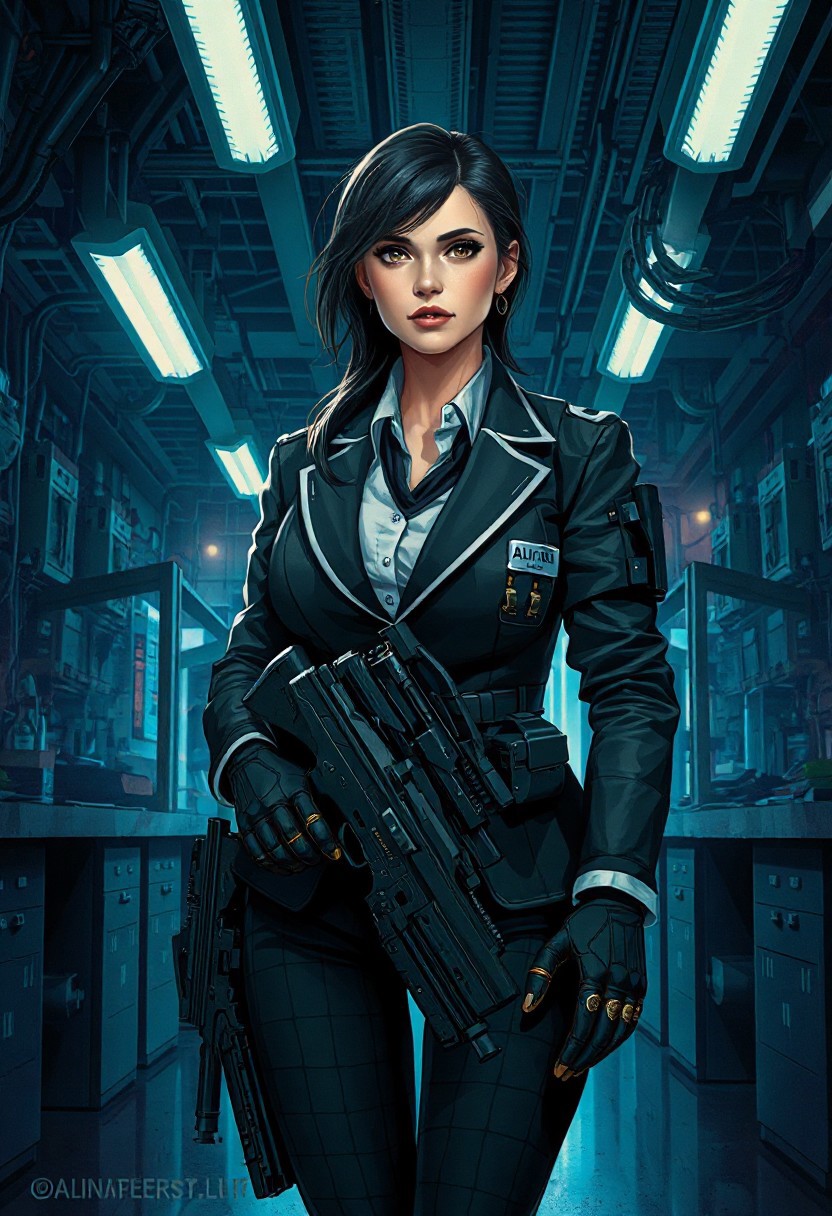 masterpiece, cinematic, hyper-realistic illustration of a mature woman in a futuristic schoolgirl business suit, standing confidently in a high-tech laboratory. She is armed with advanced tactical gear and futuristic weapons, with a focused and determined expression. The scene features dramatic lighting, intricate details, and a moody, atmospheric background inspired by Simon Stalenhag and Ash Thorp. No anime style, no cartoon, realistic proportions.