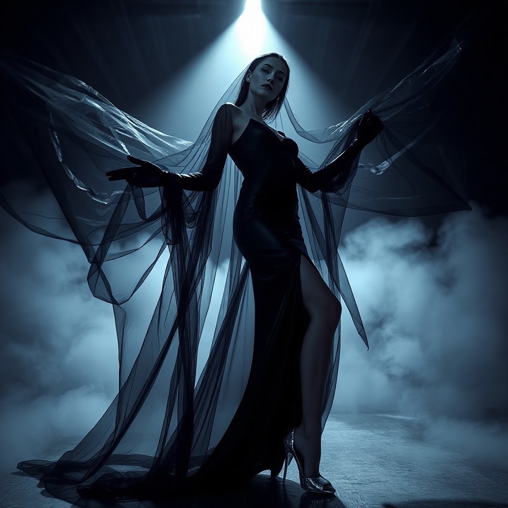 noble norvegian femme fatal lady posing standing wearing evening GLOSSY THIN BLACK slime high slit gown, GLOVES and high heels, entrapped in giant long waving ultrathin transparent fisnet veils, surrounded by fog from the floor, captured in light beam from celling, breeding chamber, ultrathin waisym reminiscent of H.R. Giger, Zdzisław Beksinski, and Ash Thorp's dark, sleek styles, with close-up glamour photography, glossy satin and silver heels glistening, fleshy slime dripping, and dark shadows.
