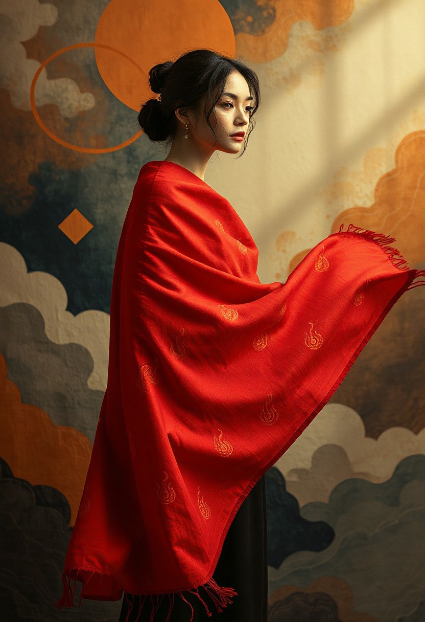 Full-body contemporary abstract photograph of a elegant woman wearing a flowing crimson cashmere shawl with delicate golden flame patterns, standing in a semi-surreal environment blending organic shapes and architectural elements. The background features dreamlike washes of indigo and burnt orange, with subtle floating geometric motifs inspired by Ukiyo-e clouds. Lighting combines soft studio strobes with atmospheric glow, creating dimensional shadows that interact with the shawl's folds. Composition balances realistic human proportions with slightly exaggerated fabric movement, evoking a living oil painting. Texture details: fine wool fibers visible, slight film grain. Style fusion: Richard Avedon's fashion realism + Egon Schiele's expressive lines + niji's color vibrancy (but photorealistic).