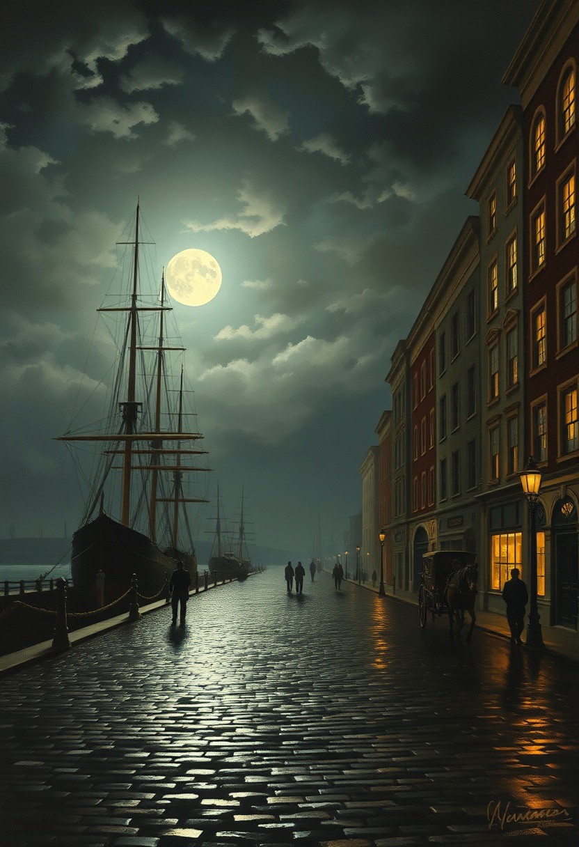 This captivating painting depicts a moonlit dockside scene, exuding an atmospheric tranquility. The prominent full moon casts a silvery glow through a heavily clouded sky, illuminating the wet cobblestone street and the dark waters of the harbor. On the left, several tall-masted ships stand silhouetted against the nocturnal light, their rigging intricate and still. To the right, a row of multi-story buildings lines the street, their windows emanating warm, inviting light that contrasts with the cool tones of the night. A few solitary figures are visible on the street, one perhaps waiting by the ships, another walking under the soft glow of a streetlamp, and a horse-drawn carriage appears to be making its way through the scene. The overall impression is one of quiet solitude and subtle beauty, a snapshot of a bustling port settling down under the watchful eye of the moon. The textures of the wet ground reflect the light, adding depth and realism to this evocative nighttime vista.