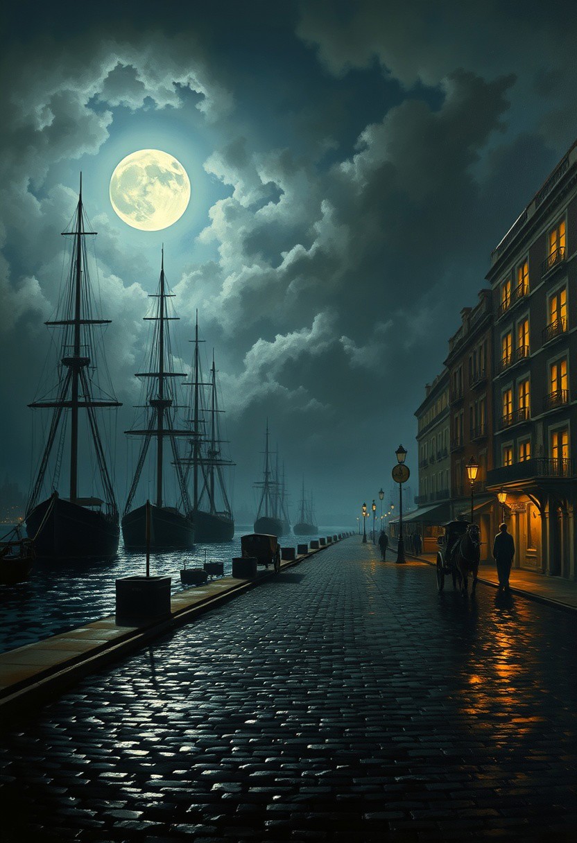 This captivating painting depicts a moonlit dockside scene, exuding an atmospheric tranquility. The prominent full moon casts a silvery glow through a heavily clouded sky, illuminating the wet cobblestone street and the dark waters of the harbor. On the left, several tall-masted ships stand silhouetted against the nocturnal light, their rigging intricate and still. To the right, a row of multi-story buildings lines the street, their windows emanating warm, inviting light that contrasts with the cool tones of the night. A few solitary figures are visible on the street, one perhaps waiting by the ships, another walking under the soft glow of a streetlamp, and a horse-drawn carriage appears to be making its way through the scene. The overall impression is one of quiet solitude and subtle beauty, a snapshot of a bustling port settling down under the watchful eye of the moon. The textures of the wet ground reflect the light, adding depth and realism to this evocative nighttime vista.