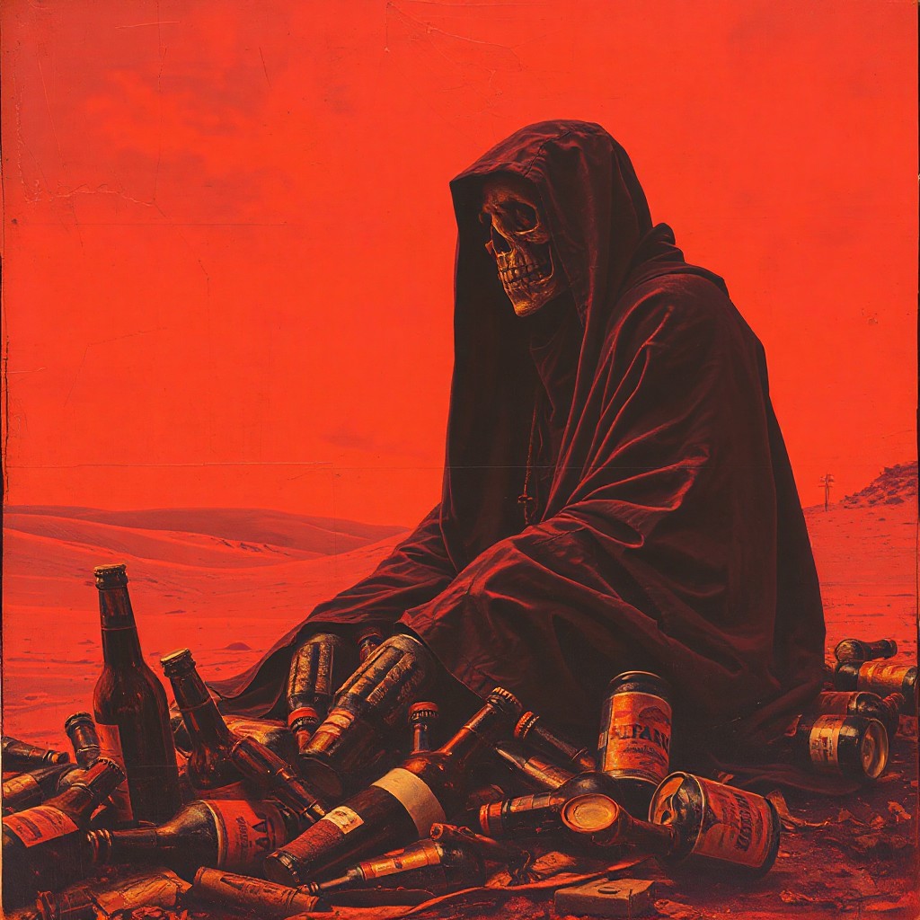 Dark art Side view of an cloaked ominous monk from the 70s-style pulp paintings sitting in a pile of beer cans and bottles in a red mystical desert, The sky is red and otherworldy. The monks grinning skeletal face is barely visible. Duotone: Burnt orange and deep plum. Mood: Occult ritual meets 80's crinkled concert poster art style. Grim reaper, doom metal-style, gritty, desert ritual, tales from the crypt