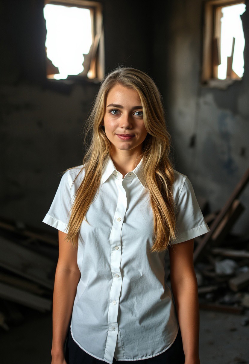Shot on iPhone photo of a young woman with blonde hair, standing in an abandoned dark building, wearing a white shirt and black skirt. She has a neutral, slight smile. Soft natural light from broken windows illuminates her face and outfit, realistic shadows around. In the background, ruined walls and construction debris. Authentic, lively, smartphone photo, unedited, as if taken on a phone.