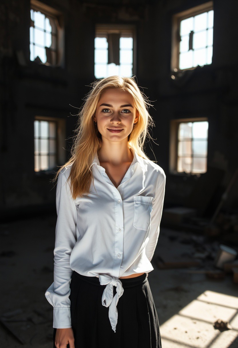 Shot on iPhone photo of a young woman with blonde hair, standing in an abandoned dark building, wearing a white shirt and black skirt. She has a neutral, slight smile. Soft natural light from broken windows illuminates her face and outfit, realistic shadows around. In the background, ruined walls and construction debris. Authentic, lively, smartphone photo, unedited, as if taken on a phone.