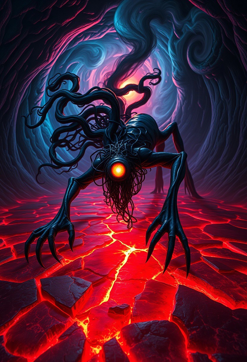 twisted, elongated creature with sharp, sinewy limbs and clawed hands crawling across a glowing, fractured red and black ground, its body made of intricate, web-like tendrils resembling tangled roots; the creature's shadowy face features a glowing, singular circular eye that pulses faintly with light, surrounded by flowing dark masses resembling smoke or hair. The background swirls with chaotic fractal patterns in deep blues, purples, and fiery reds, resembling a warped, nightmarish tunnel. The scene is lit with harsh, neon-like lighting, casting sharp contrasts and reflections on the creature’s body and the jagged surface beneath, with an otherworldly glow emanating from the tunnel's fiery center. High contrast, sharp details, and eerie, swirling textures dominate the surreal composition.