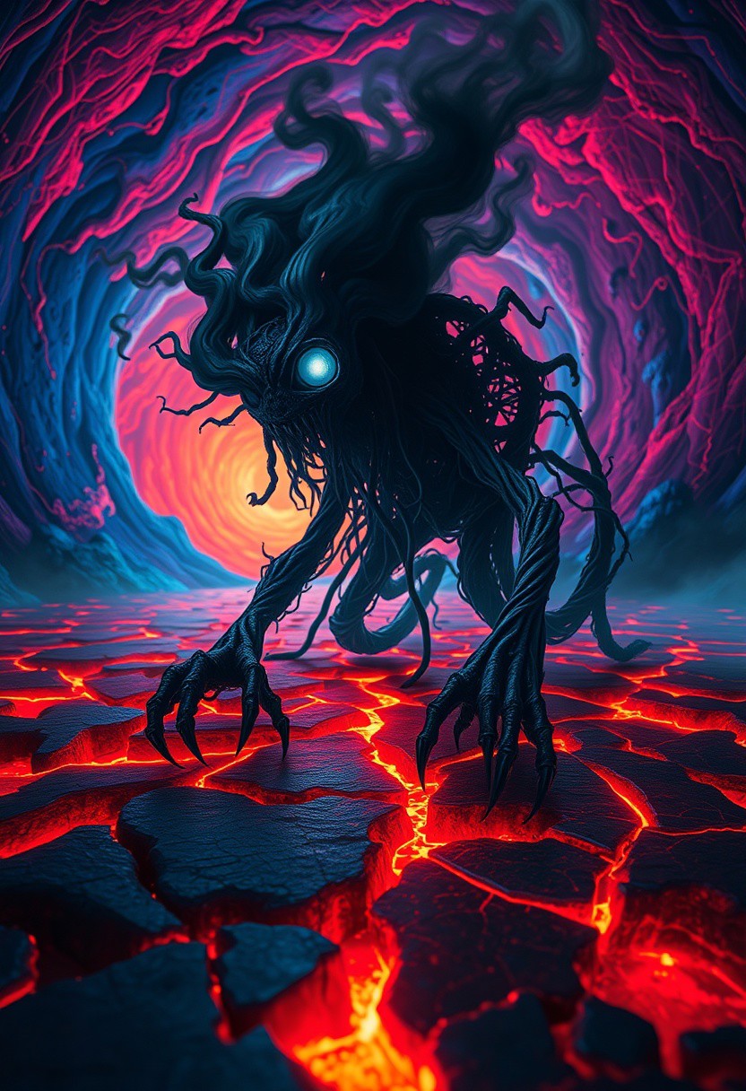 twisted, elongated creature with sharp, sinewy limbs and clawed hands crawling across a glowing, fractured red and black ground, its body made of intricate, web-like tendrils resembling tangled roots; the creature's shadowy face features a glowing, singular circular eye that pulses faintly with light, surrounded by flowing dark masses resembling smoke or hair. The background swirls with chaotic fractal patterns in deep blues, purples, and fiery reds, resembling a warped, nightmarish tunnel. The scene is lit with harsh, neon-like lighting, casting sharp contrasts and reflections on the creature’s body and the jagged surface beneath, with an otherworldly glow emanating from the tunnel's fiery center. High contrast, sharp details, and eerie, swirling textures dominate the surreal composition.