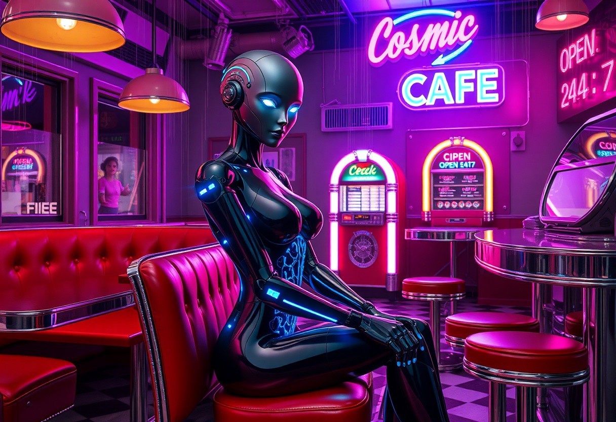 A sleek humanoid android with polished chrome and matte black body panels, glowing blue circuit patterns visible beneath translucent skin sections, sitting at a red vinyl booth in a classic 1950s American diner. The android has an elegant feminine form with articulated joints, LED strip accents along the limbs, and softly glowing cyan eyes. Subtle holographic displays project from forearm panels. Classic diner interior with checkered black and white floor tiles, red vinyl booths and chrome-trimmed stools, curved chrome counter with glass pie cases. Retro jukebox in corner with colorful lights. Vibrant neon lighting casting pink, blue, and purple glows throughout the space. Neon signs on walls reading "COSMIC CAFÉ" and "OPEN 24/7" in retro cursive fonts. Atmospheric haze and light rays cutting through smoky air. Warm tungsten lighting from vintage pendant lamps mixed with cool neon colors. Holographic menu displays floating above tables, digital rain effects on windows, subtle glitch artifacts in reflections, chrome surfaces reflecting neon colors, futuristic modifications to classic diner equipment with LED accents and digital displays. Cyberpunk atmosphere, cinematic composition, dramatic lighting, high contrast, photorealistic rendering, detailed textures, 8K quality, professional photography style, slight film grain, color grading with cyan and magenta tones, retro-futuristic aesthetic.