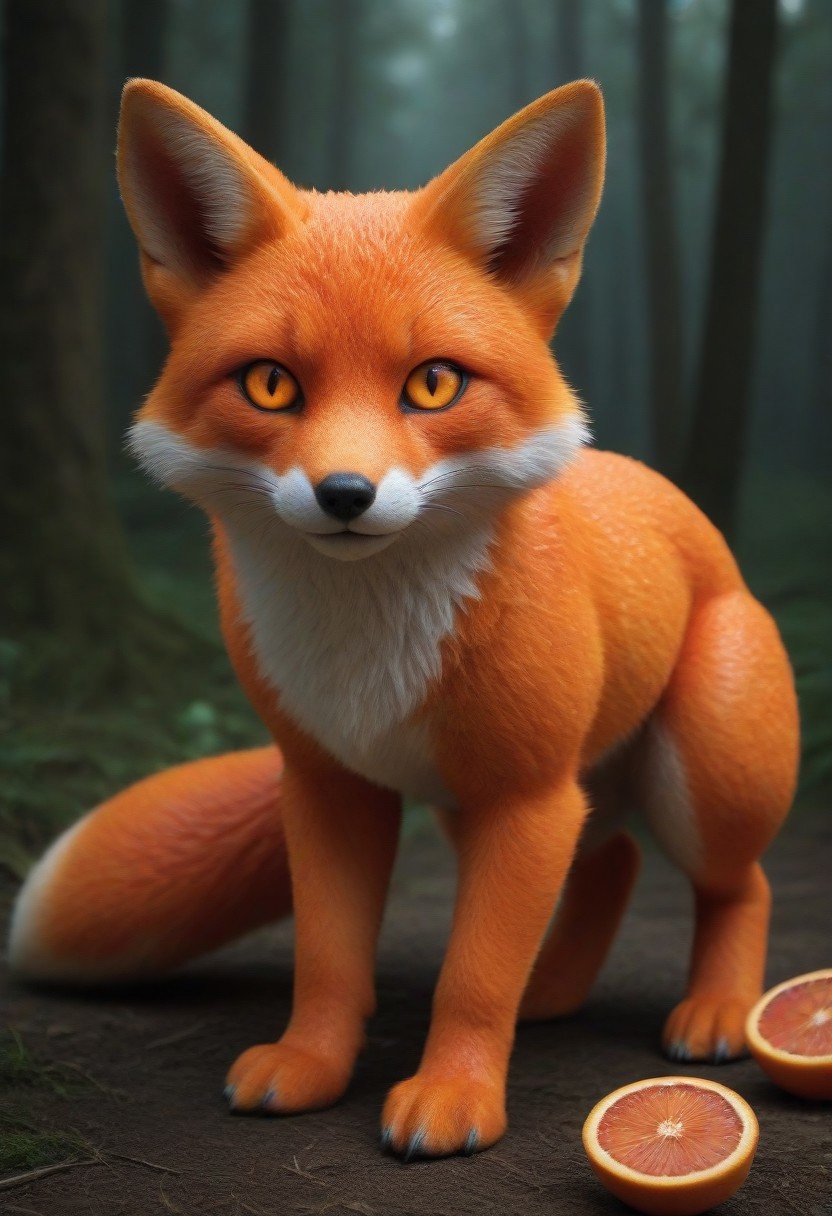 a surreal fox with textured blood orange peel fur, glowing eyes like citrus pulp, tail shaped like orange segments, fantasy creature design, highly detailed, magical forest setting, cinematic lighting, vibrant colors, mystical animal portrait, taste blood orange style, orange peel texture, fruit-fur hybrid, glowing citrus eyes, pulp glow, fantasy mutation, citrus creature