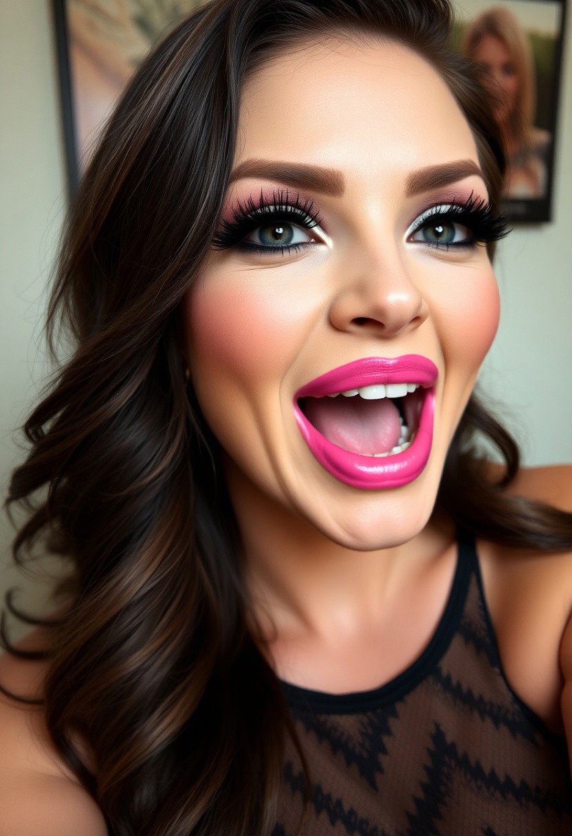 Open mouth. heavy makeup. Bright Creamy pink lipstick. Slut makeup. huge fake lips. Huge thick black false eyelashes. Bimbo cougar milf. Pov blowjob. Huge glossy lips. Extremely beautiful full face bimbo. Thick pink lipstick with heavy lip liner.