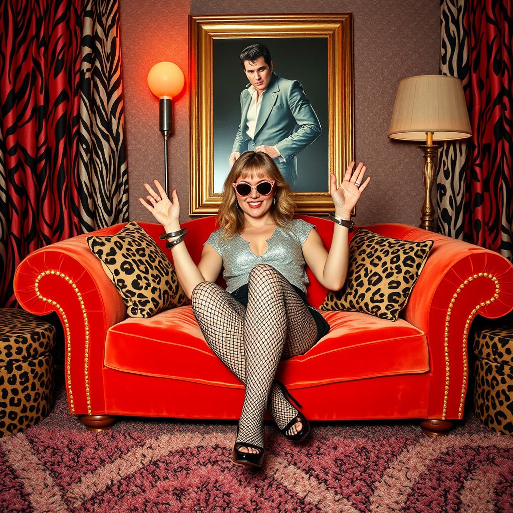 A woman reclines seductively on a gaudy velvet couch, her wrists playfully bound in front with shiny metal handcuffs. The room around her is a riot of clashing colors—zebra-striped curtains, leopard print cushions, polka dot wallpaper, and a shag carpet underfoot. A velvet Elvis painting looms behind her, flanked by a lava lamp and gold-framed mirror. She wears a mismatched outfit: fishnet stockings, high heels, a glittery blouse, and oversized sunglasses perched on her nose. Her bold makeup and playful smirk suggest she knows exactly how ridiculous—and irresistible—she looks.