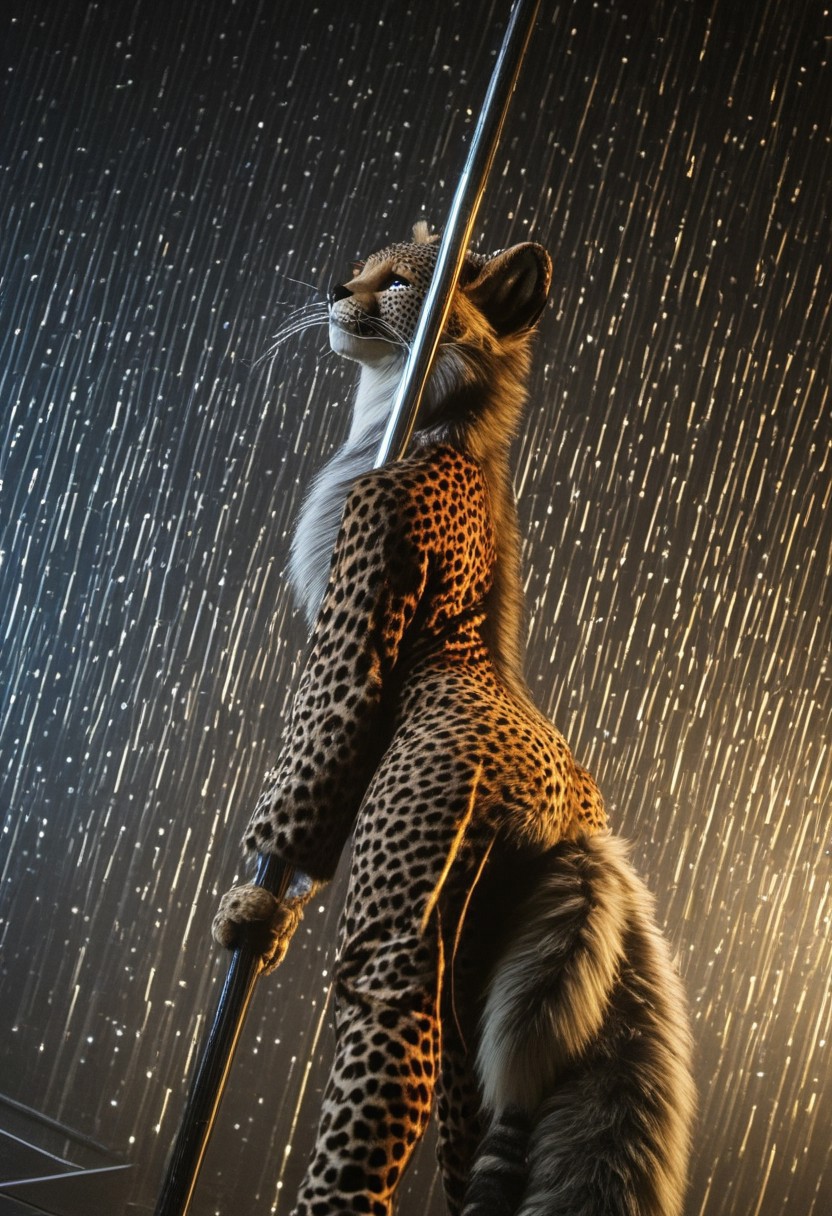 RetroBG, big fluffy tail, fluffy cheeks, ,masterpiece, best quality, amazing quality, very aesthetic, light particles, high resolution, ultra-detailed, absurdres, newest, night, scenery, leppard, spotted fur, lynx, cheetah, high quality, fluffy fur, solo, 1girl, furry female, anthro, furry,cinematic composition, dark shadows, realistic, detailed,(pole dancing on a lit stage), one strip pole, nightclub, night club, light particles, half-closed eyes, cleavage, dutch angle, beautiful face, eyeshadow, slim, smile, teasing and tempting energy, RetroBG