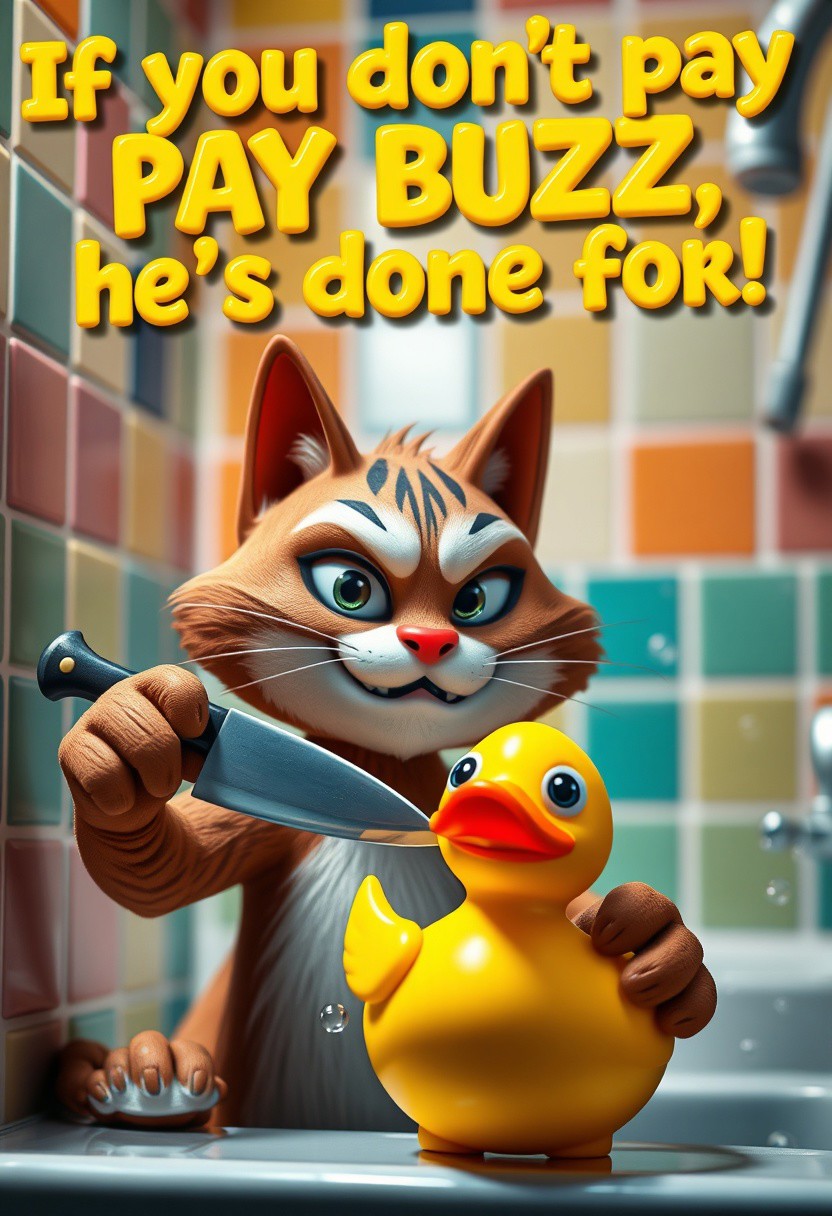 A humorous and vibrant scene for a FLUX-generated image: A mischievous cartoon cat with a sly grin, holding a plastic knife menacingly toward a wide-eyed rubber duck. The setting is a bright, playful bathroom with colorful tiles and bubbles floating around. Above the cat, bold yellow plastic letters spell out, "If you don't pay BUZZ, he's done for!" The style is whimsical, with exaggerated expressions, vivid colors, and a glossy, toy-like aesthetic. Dramatic lighting adds a comedic, mock-threatening vibe.