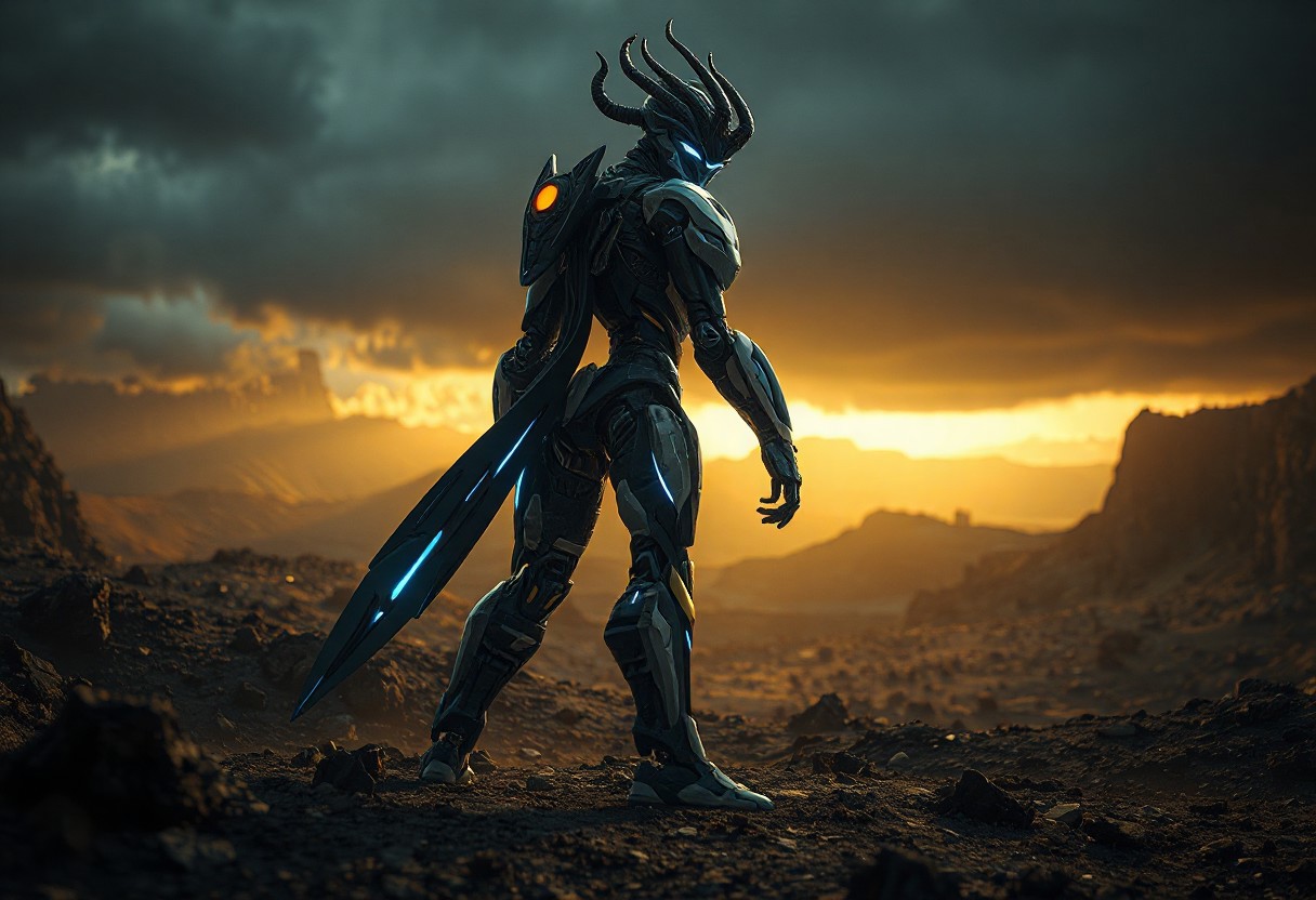 A powerful details Vulcan divine robot, rendered in sharp black/white with vibrant blue/yellow accents, stands in a dynamic pose atop the harsh, contrasting terrain of a Harpies' Hunting Ground, head turned, surveying the scene. Creative cinematic angle, captivating lighting, golden ratio composition, deep focus. Highly detailed 4K render, Octane, Unreal Engine 5, matte painting, CGSociety, trending on Artstation, contemporary aesthetics, handcrafted precision.