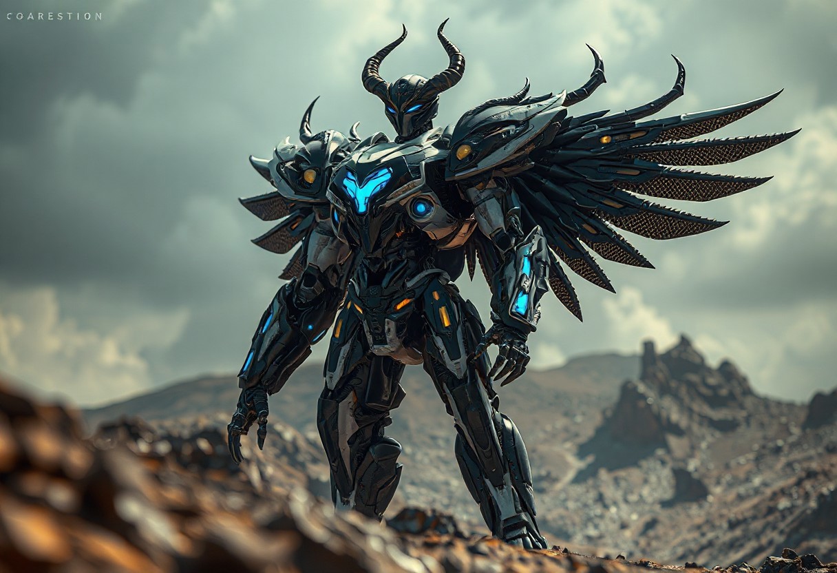 A powerful details Vulcan divine robot, rendered in sharp black/white with vibrant blue/yellow accents, stands in a dynamic pose atop the harsh, contrasting terrain of a Harpies' Hunting Ground, head turned, surveying the scene. Creative cinematic angle, captivating lighting, golden ratio composition, deep focus. Highly detailed 4K render, Octane, Unreal Engine 5, matte painting, CGSociety, trending on Artstation, contemporary aesthetics, handcrafted precision.
