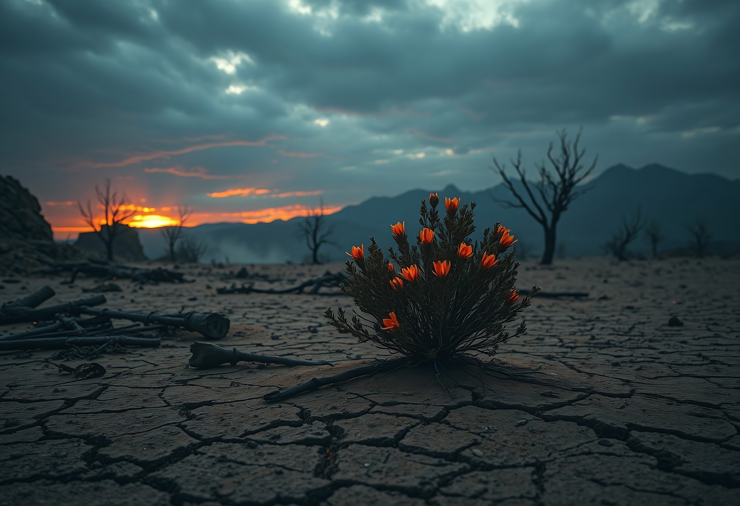 fake or not fake, Post-apocalyptic landscape shot, wide-angle view of a devastated sandstone desert wasteland. Burnt, cracked earth with scattered metallic debris and fragments of destroyed structures. Eroded rocky formations and charred, skeletal trees stand under a dark, ash-filled sky. The air is thick with radioactive dust and glowing orange embers drifting through a dim, stormy atmosphere. In the distance, jagged mountains silhouetted against a clouded blood-red and grey sunset. Amid the desolation, a single delicate but lush bush grows and blooms — glowing softly in orange and white light, petals almost translucent, radiating a faint warmth. The contrast between the fragile bloom and the ruined world highlights a haunting beauty. Fine mist and glowing dust particles surround the scene. Low-angle, cinematic, emotionally charged, Ultra high-resolution, 32k DSLR quality, UHD, shallow depth of field, neutral and desaturated color grading, photo-realistic, textured details.