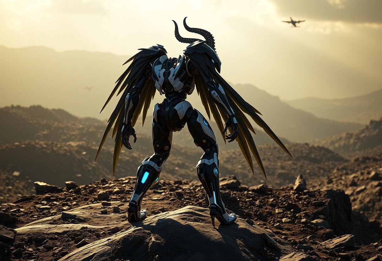 A powerful details Vulcan divine robot, rendered in sharp black/white with vibrant blue/yellow accents, stands in a dynamic pose atop the harsh, contrasting terrain of a Harpies' Hunting Ground, head turned, surveying the scene. Creative cinematic angle, captivating lighting, golden ratio composition, deep focus. Highly detailed 4K render, Octane, Unreal Engine 5, matte painting, CGSociety, trending on Artstation, contemporary aesthetics, handcrafted precision.