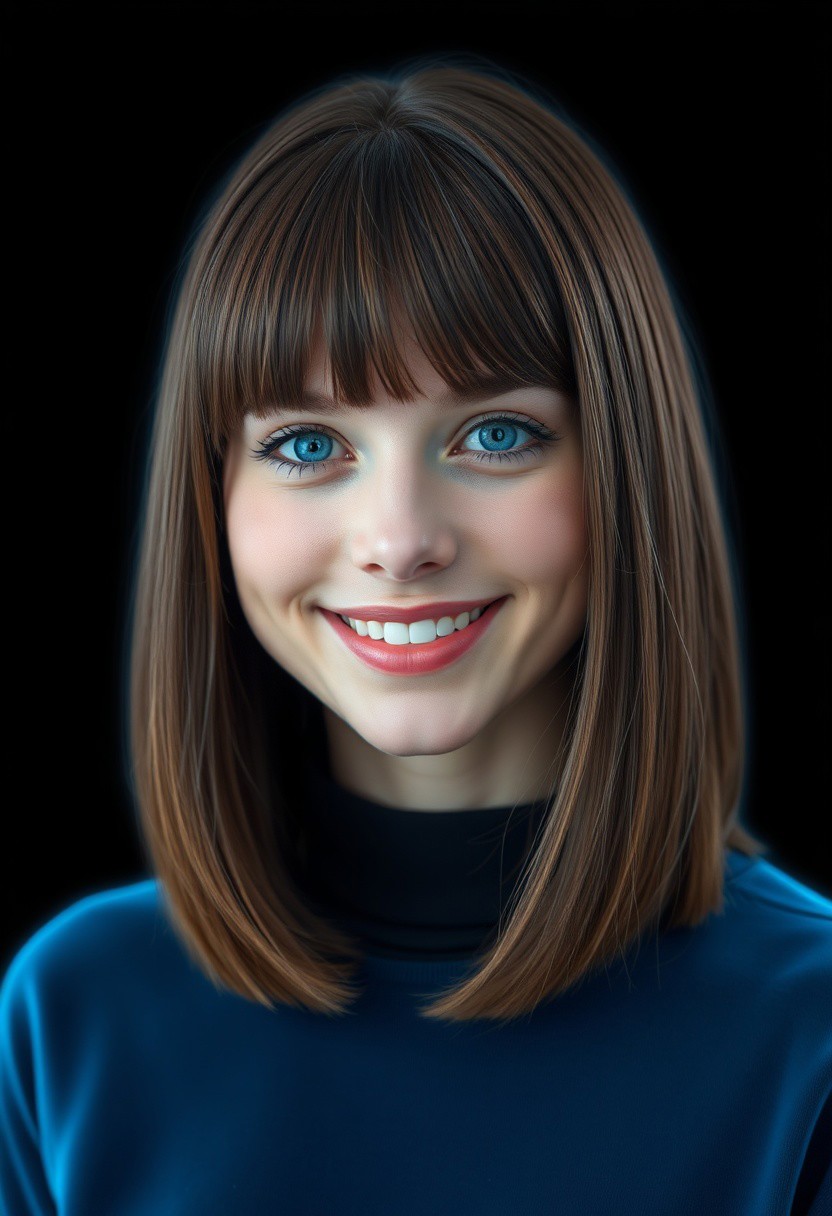 a holographic woman, shoulder length brown hair, short straight bangs, extremely beautiful, face focus, head and shoulders only, simple black background, glowing blue, transparent, friendly smile, blue eyes