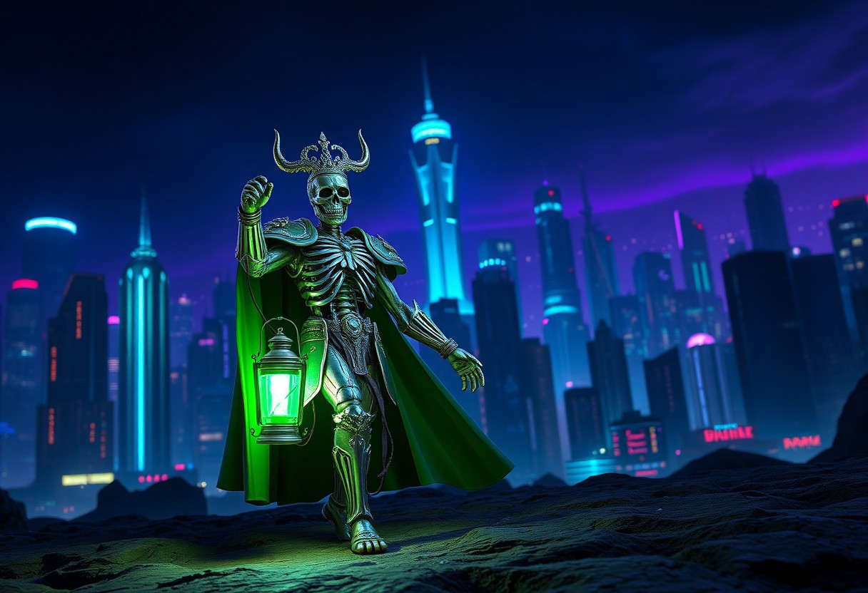 expert Intricate A Fossil Warrior Skull King, in a green and silver suit, stands on a dark cityscape surface. He holds a vibrant green glowing lantern in his right hand, casting a powerful light. Behind him, a futuristic metropolis glows with deep blue and purple neon, creating dramatic contrast against the night sky. Dynamic isometric pose, low angle cinematic shot with sharp focus, strong side rim lighting, golden ratio composition. Matte painting, Splash Ink Illustration, Octane Render, Unreal Engine 5, Raphael Style, Houdini Style, CGSociety, trending on Artstation. Hyperdetailed, stunning quality, vibrant colors, visionary art by Eric Zener and Elson.