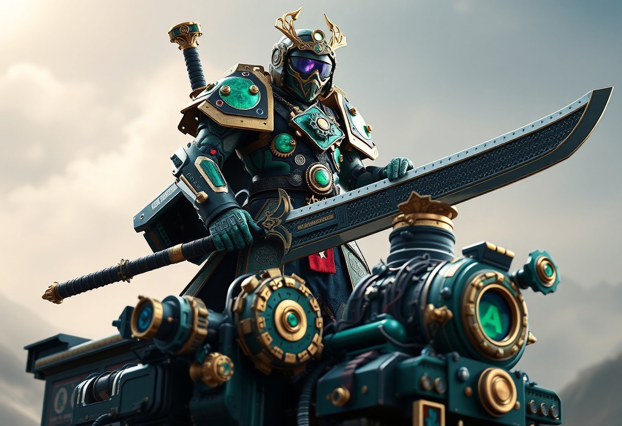 expert Intricate Ancient Gear Engineer steampunk, emerald green & sapphire blue & gold accents, humanoid mech, visor, confident stance, hand on hip, holding large Fusion Sword Murasame Blade, standing tall on a Superheavy Samurai Steam Train King. Hyper detailed, cinematic lighting, sharp focus, isometric, contemporary aesthetics, splash ink style, Raphael/Houdini influence, Octane render, Unreal Engine 5, 4K, high resolution, impeccable composition, CGSociety, trending on ArtstationHQ, Golden Ratio.