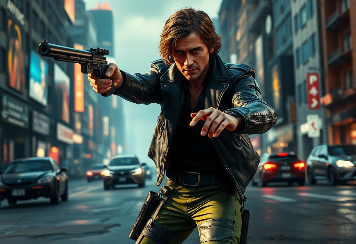 expert Intricate Cyborg Han Solo from Star Wars, centered in dynamic action pose, black leather jacket, green pants, blaster pointed left as main focal point. Foreground street surface, background cyberpunk cityscape with buildings & cars. Captivating cinematic lighting, high detail, intricate textures, lifelike details, beautiful detailed eyes. Matte painting, splash ink illustration, Octane Render, Unreal Engine 5. Golden Ratio, Impeccable Composition, Creative Angle, Sharp Focus, 4K, trending on Artstation, CGSociety.