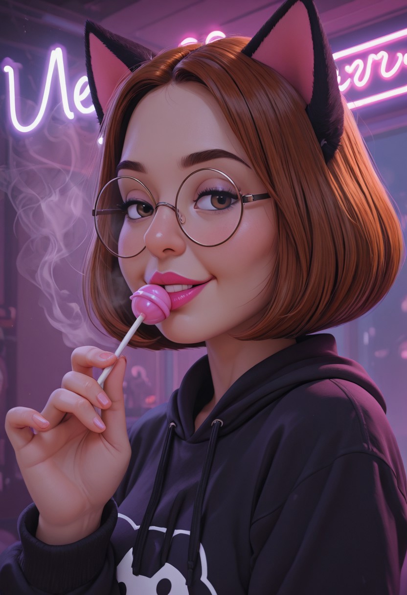 solo,1girl,meg griffin,lollipop,seductive smile, bob cut,brown hair,round eyewear,glasses,pink lips,short hair, steam,neon lights, catgirl costume,