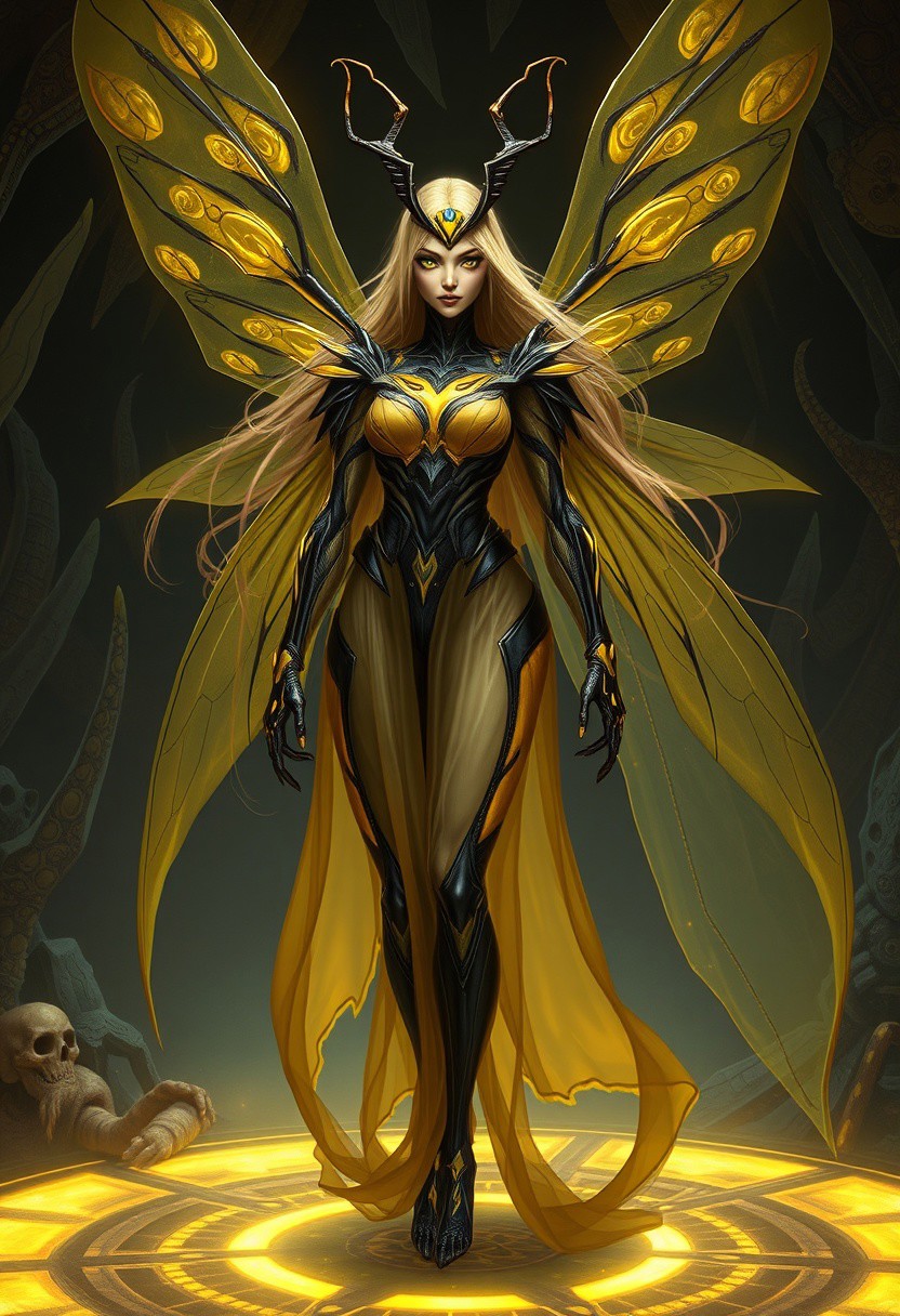 (masterpiece, best quality), Vesperia from Primal Hunter, humanoid vespernat queen, tall and commanding female form, approximately 2.3 meters tall, long flowing golden hair, black eyes with radiant yellow irises, yellow and black antennae rising from her forehead, sheer wasp-stripe dress in alternating translucent yellow and black, dress flowing elegantly around her limbs, chitinous yellow-and-black accents peeking through the fabric like armor, regal and alien beauty, lean muscular proportions with insectoid undertones, graceful four-fingered hands, soft bioluminescent glow in yellow highlights, high fantasy science fiction setting, faint humming from vestigial wings under her dress, standing on a raised bioluminescent platform in her hive, dignified, elegant yet unnerving presence, aura of psionic command, digital painting, highly detailed concept art, fantasy xenoqueen, by greg rutkowski and wlop