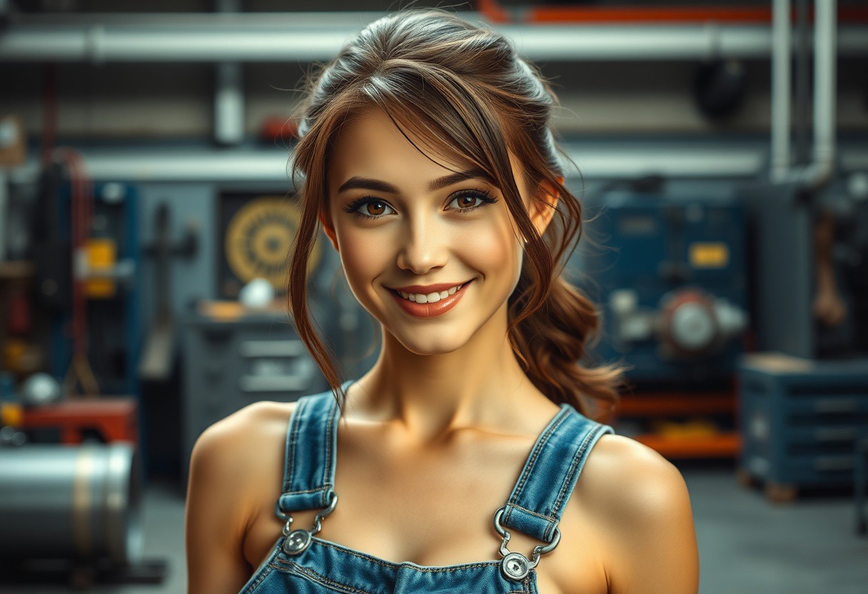 (cute girl:1.2), graphic for a loading screen of a vidoe game, stunning, perfect, sexy, 8k, beautiful, (beautiful face:1.4), oiled body, standing in a mechanical workshop, wearing nothing but denim overalls, smiling, close up