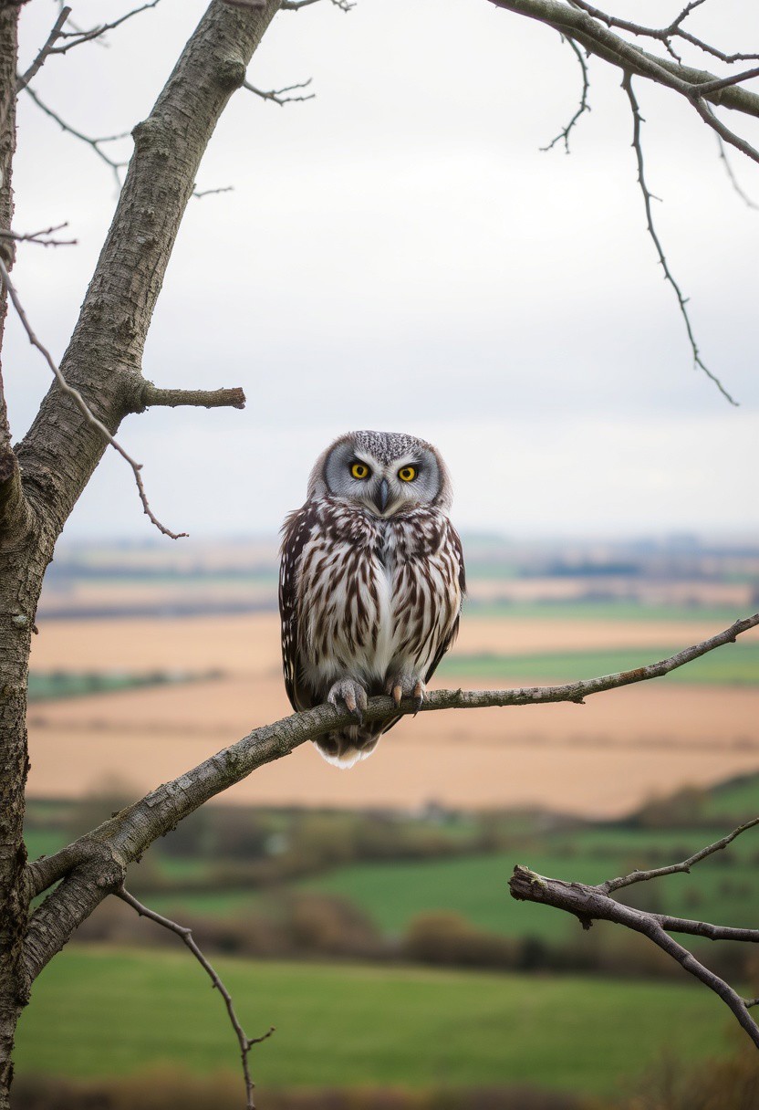 owl, looking bored, on a branch, daylight, high in a tree, plain fields in the background, rural ireland,