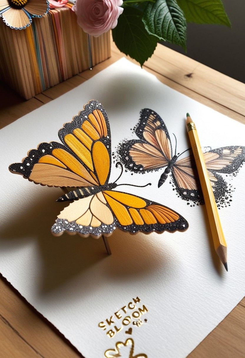 Hovering gently in a blossom’s heart, a butterfly entirely formed from tiny, glossy pencil shavings sips from a warm puddle of ink nestled inside a flower. Its wings are delicate layers of curled graphite sketches on tracing paper, semi-transparent, edged with jagged strokes of golden wood grain and fluttering in the sunlight like animated illustrations. Each leg ends in a drop of shimmering pencil lead dust, and its antennae curl like whimsical eraser smudges. Twisting ribbons of coiled shavings wrap around the bloom, while nearby leaves glisten with droplets of watercolor and pastel pigment. A small wooden sign hangs above the flower, engraved with: “Sketch & Bloom – Pollinate Your Imagination.”