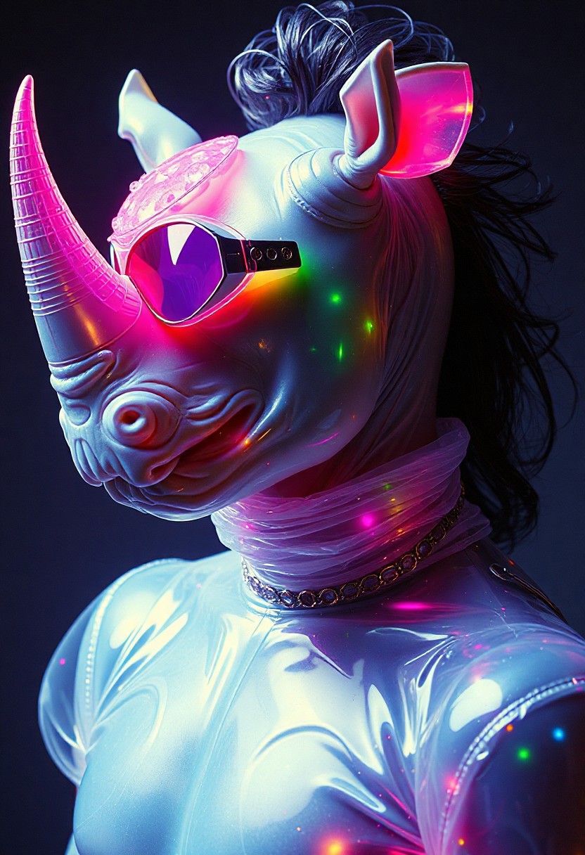 Male rhino superhero model , crystallisation, schizophernia, bioluminescent Jem the Hologram, surreal psychedelic flowing avant-garde art by Yoh Nagao and Erik Madigan Heck and Alan Aldridge, 1980's new wave totally radical fashion.,side view, side eye,