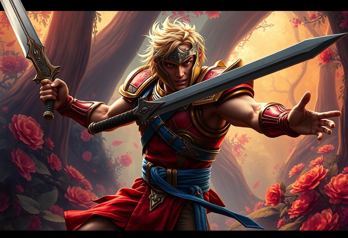 Litmus Doom Swordsman, Masters of the Universe, dynamic action pose, arms outstretched, poised for battle, in a vibrant Lost Forest background, rich floral detail. Iconic red and gold armor, blue belt, messy blonde hair, fierce expression, facing right, striking composition. Captivating lighting. Fantasy illustration, trending on ArtstationHQ, CGSociety, 4K, hyperdetailed, cinematic, Unreal Engine 5, Octane Render, beautiful matte painting, splash ink elements, Raphael & Houdini influence, dramatic colors, golden ratio.