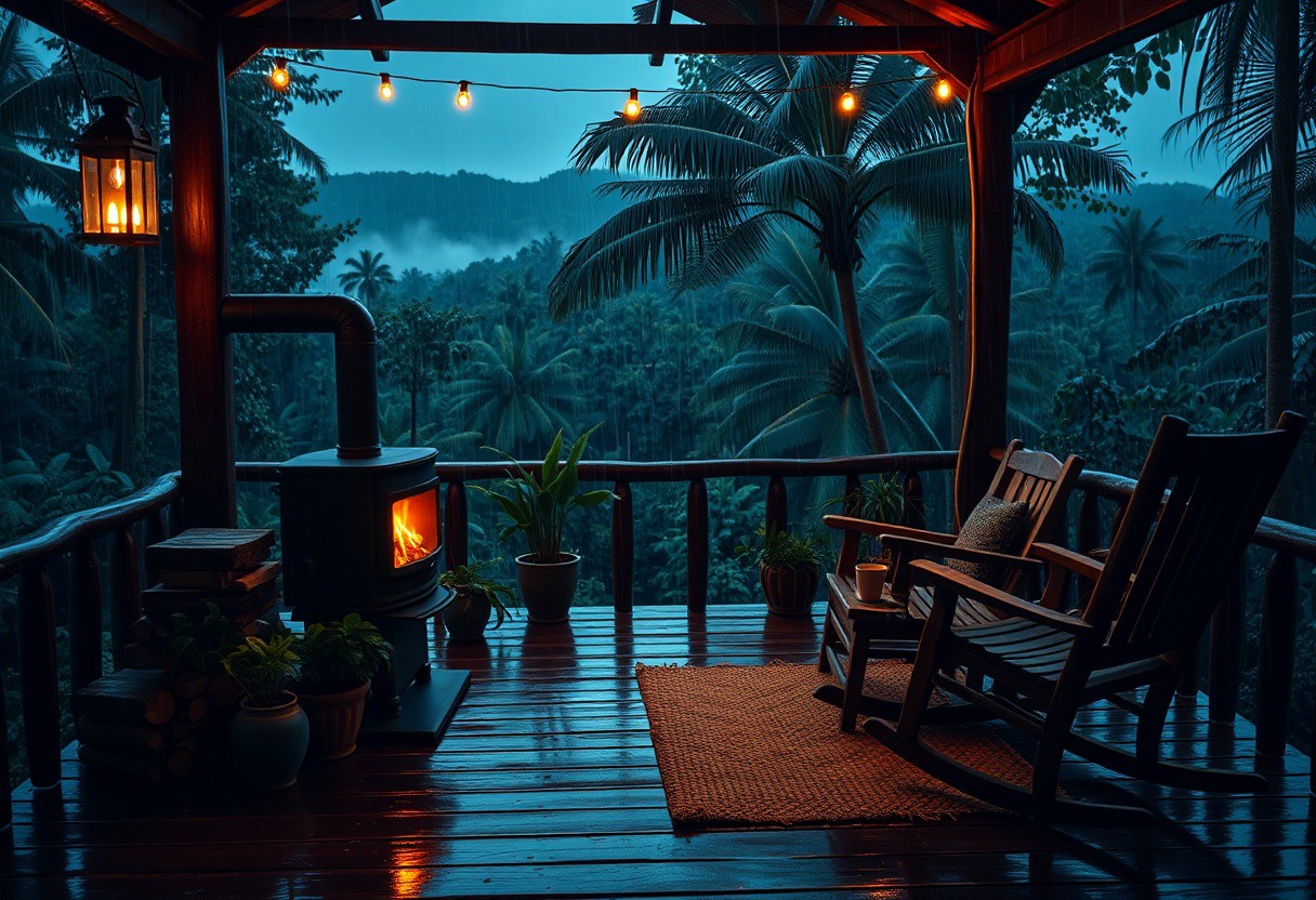 A cozy wooden cabin porch in the middle of a lush, tropical rain forest during a nighttime rainstorm. The porch is warmly lit by a glowing lantern and a crackling fire inside a freestanding black metal fireplace. Rain pours heavily in the background, with mist rising between densely packed forest trees and distant jungle hills. The porch floor is wet and reflective, with stacked logs of firewood, green potted plants, and rustic wooden furniture, including a rocking chair and a small table holding a cup and a pitcher. A woven rug adds a touch of warmth to the space. The overall atmosphere is tranquil, immersive, and cinematic — ideal for a relaxing ASMR or ambient scene. Soft warm lighting contrasts beautifully with the deep blues and greens of the rain forest night.
