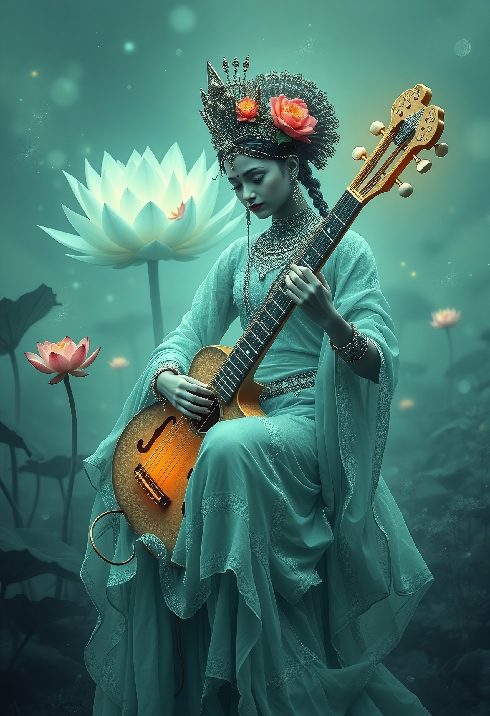 "Lotus Saraswati, octocore, fusepunk, petrol colored, mucical instrument , illusion, limitless, pale, chaotic, mucical notes , ultra detailed, cinematic "