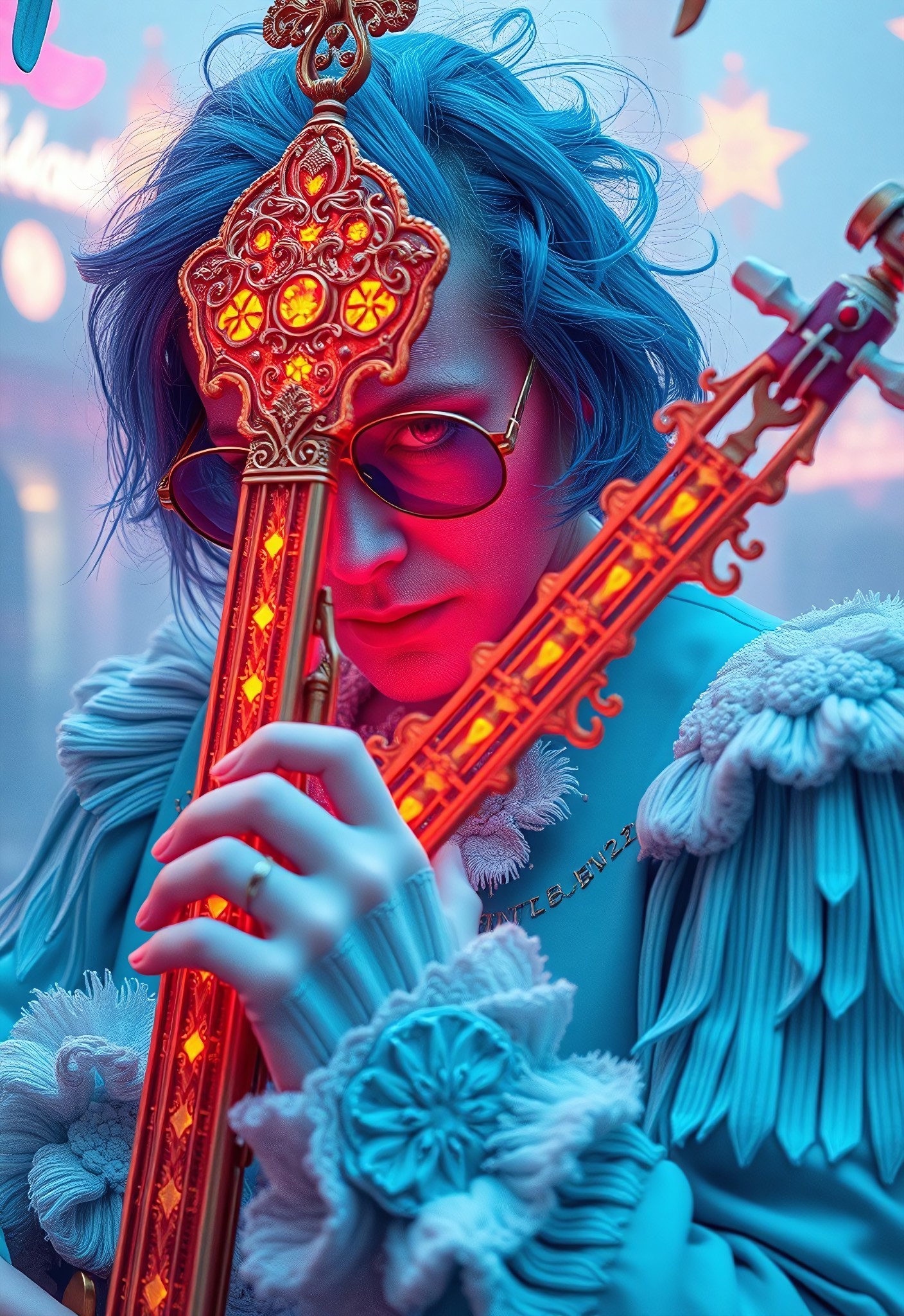 "((Color rush)), octocore, rococo punk, petrol colored, mucical instrument , illusion, limitless, pale, chaotic, mucical notes , ultra detailed, cinematic "