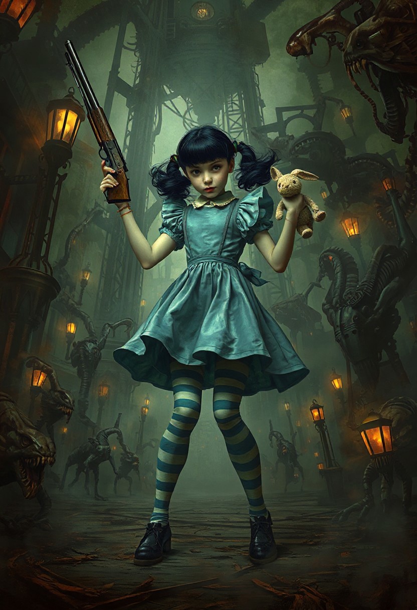 A dark and nightmarish steampunk world inspired by Tim Burton, Zdzisław Beksiński, and H.R. Giger. Towering twisted machinery and gothic architecture merge with bizarre organic structures, creating an unsettling atmosphere. Dorothy, with black pigtails, a sky blue dress, white and blue striped stockings, and black shoes, stands in a dynamic, defiant pose. In one hand, she holds an old-fashioned, menacing shotgun raised high as if ready to fire, and in the other, she clutches a worn, battered bunny doll. Her stance is slightly crouched, ready to spring into action, with her dress and hair billowing dramatically as if caught by an ominous wind. The background teems with menacing mechanical creatures, flickering gaslights, and swirling shadows, adding to the sense of chaotic energy and surreal menace.
