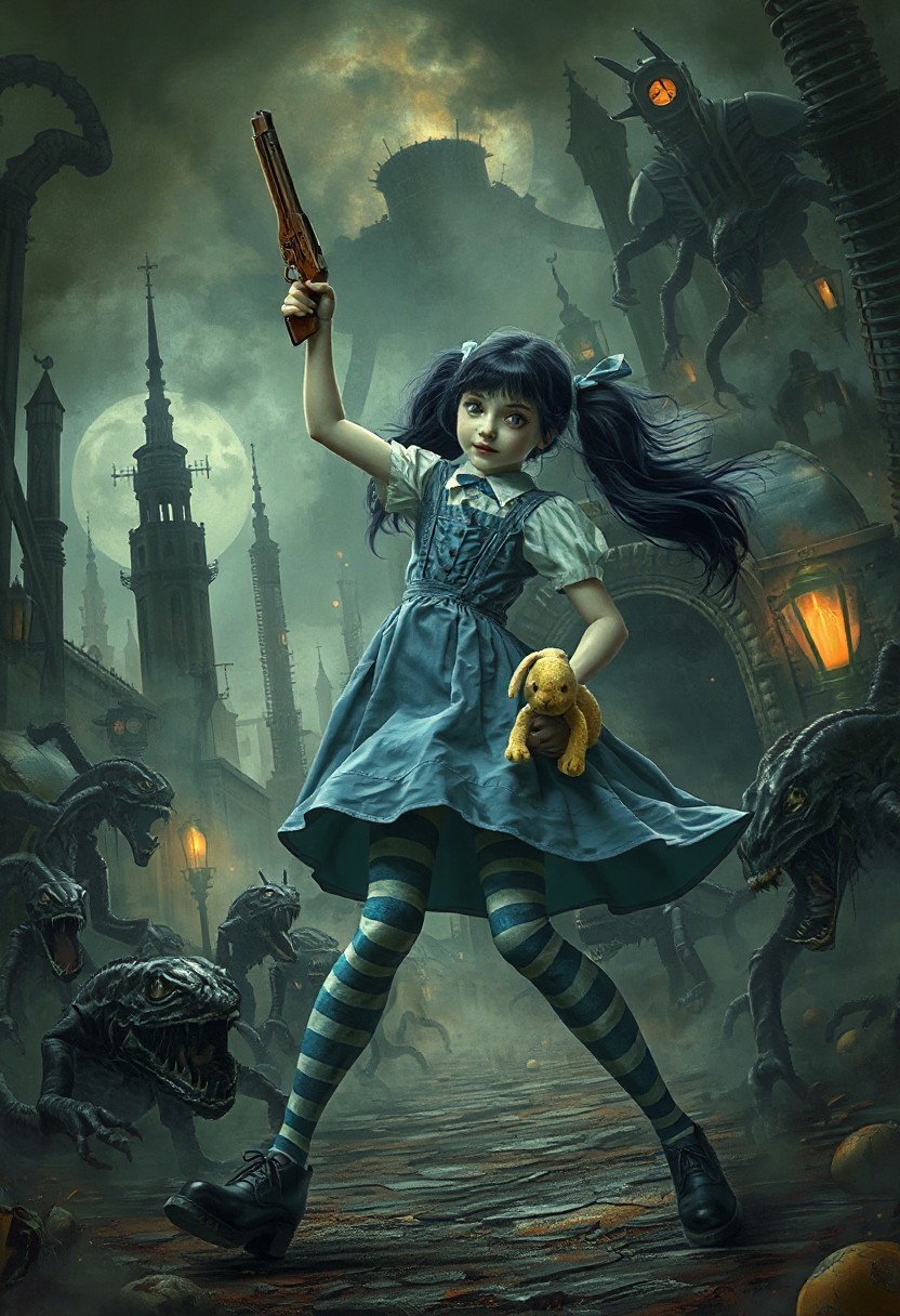 A dark and nightmarish steampunk world inspired by Tim Burton, Zdzisław Beksiński, and H.R. Giger. Towering twisted machinery and gothic architecture merge with bizarre organic structures, creating an unsettling atmosphere. Dorothy, with black pigtails, a sky blue dress, white and blue striped stockings, and black shoes, stands in a dynamic, defiant pose. In one hand, she holds an old-fashioned, menacing shotgun raised high as if ready to fire, and in the other, she clutches a worn, battered bunny doll. Her stance is slightly crouched, ready to spring into action, with her dress and hair billowing dramatically as if caught by an ominous wind. The background teems with menacing mechanical creatures, flickering gaslights, and swirling shadows, adding to the sense of chaotic energy and surreal menace.