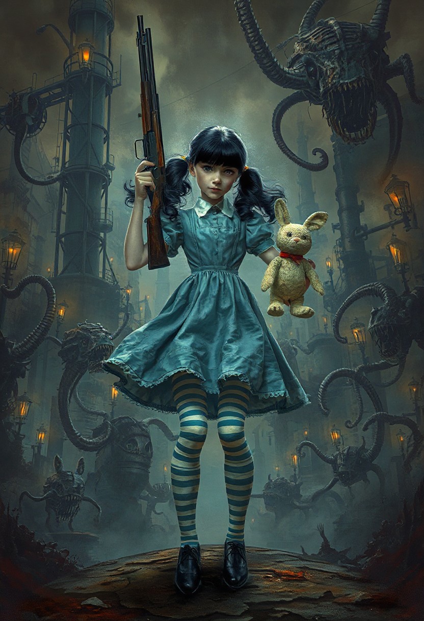 A dark and nightmarish steampunk world inspired by Tim Burton, Zdzisław Beksiński, and H.R. Giger. Towering twisted machinery and gothic architecture merge with bizarre organic structures, creating an unsettling atmosphere. Dorothy, with black pigtails, a sky blue dress, white and blue striped stockings, and black shoes, stands in a dynamic, defiant pose. In one hand, she holds an old-fashioned, menacing shotgun raised high as if ready to fire, and in the other, she clutches a worn, battered bunny doll. Her stance is slightly crouched, ready to spring into action, with her dress and hair billowing dramatically as if caught by an ominous wind. The background teems with menacing mechanical creatures, flickering gaslights, and swirling shadows, adding to the sense of chaotic energy and surreal menace.