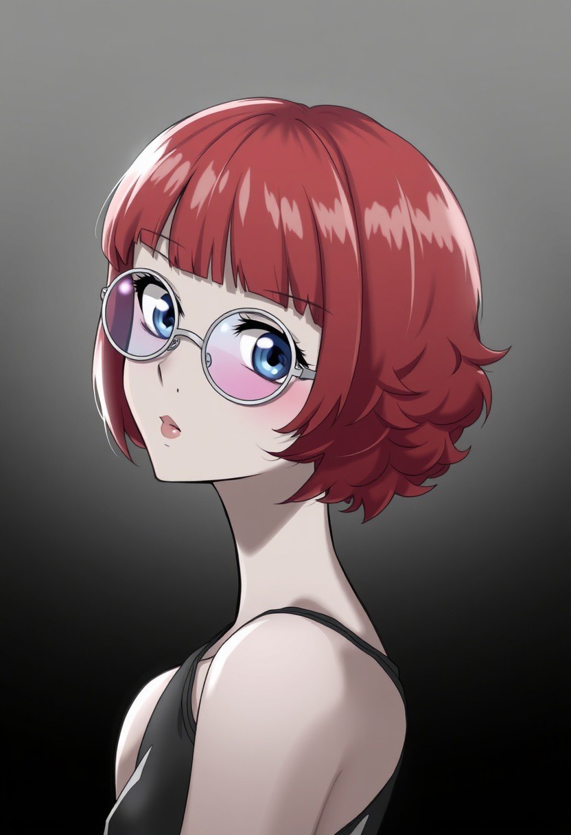 light from front, 1girl, solo,short hair,curly hair,looking at viewer, bangs, blue eyes, simple background, shirt,red hair,bare shoulders, monochrome, upper body, parted lips, glasses, sleeveless, blunt bangs, mole, lips,looking to the side, gradient background, eyelashes, mole under lip, sleeveless shirt, makeup,sunglasses, lipstick, portrait, close-up, pink lips, round eyewear, limited palette, tinted eyewear,looking over eyewear, white-framed eyewear,light blue-tinted eyewear, pink-tinted eyewear,