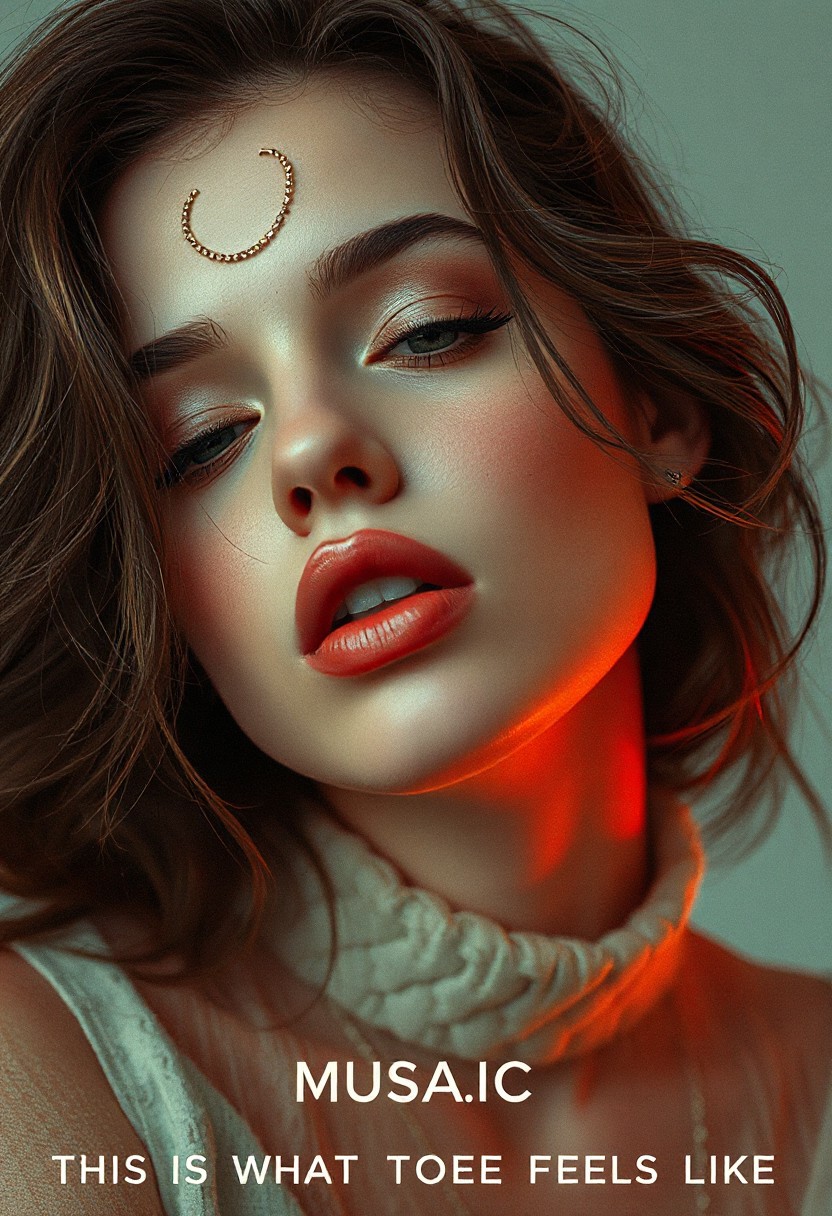 high quality design aesthetics, disco, synth pop, dynamic, detailed, pop album cover, melancholic, beautiful young white woman, artist name "MUSAIC", album title "This Is What Love Feels Like"